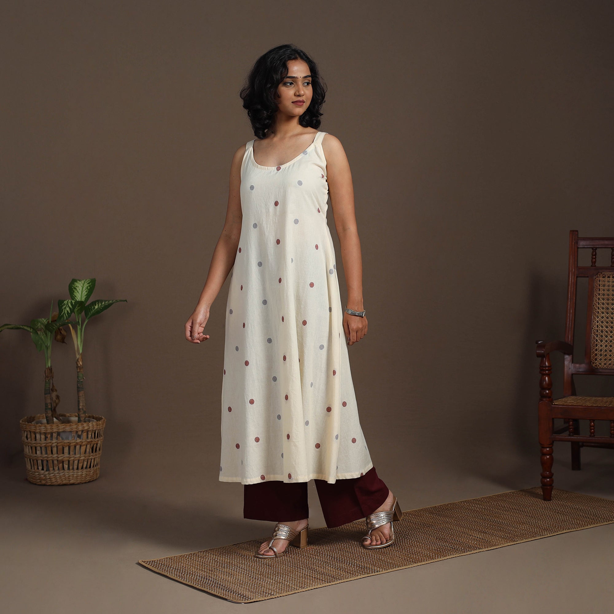 Elevate your everyday look with this A-line cotton sleeveless jacquard kurta, crafted for everyday elegance and practical ease. The jacquard technique intricately weaves patterns into the fabric, offering a soft, tactile feel. Made from breathable cotton, it ensures day-long comfort, even during busy workdays. A functional side pocket keeps essentials within reach, making it ideal for casual brunches or relaxed evenings out.