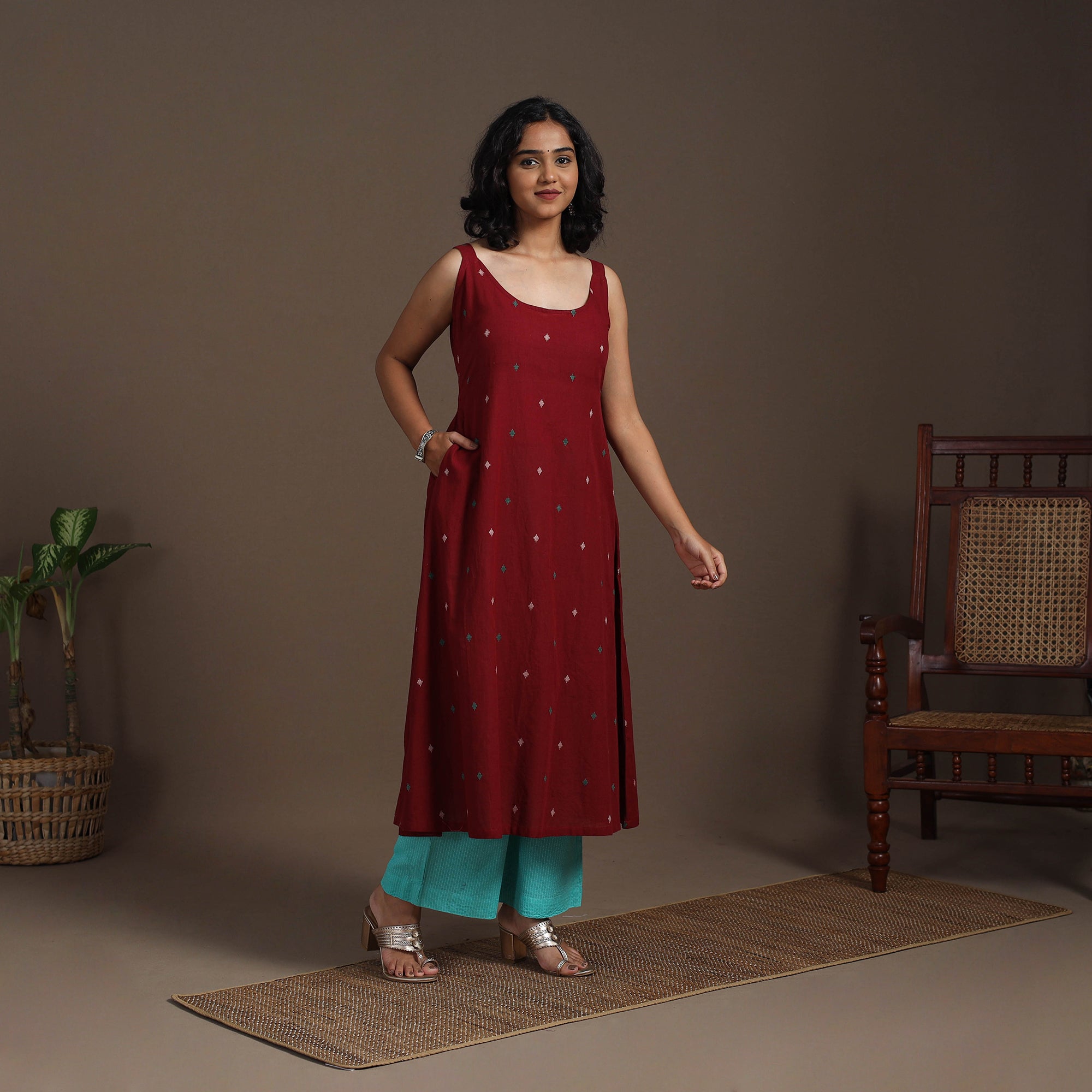 Elevate your everyday look with this A-line cotton sleeveless jacquard kurta, crafted for everyday elegance and practical ease. The jacquard technique intricately weaves patterns into the fabric, offering a soft, tactile feel. Made from breathable cotton, it ensures day-long comfort, even during busy workdays. A functional side pocket keeps essentials within reach, making it ideal for casual brunches or relaxed evenings out.