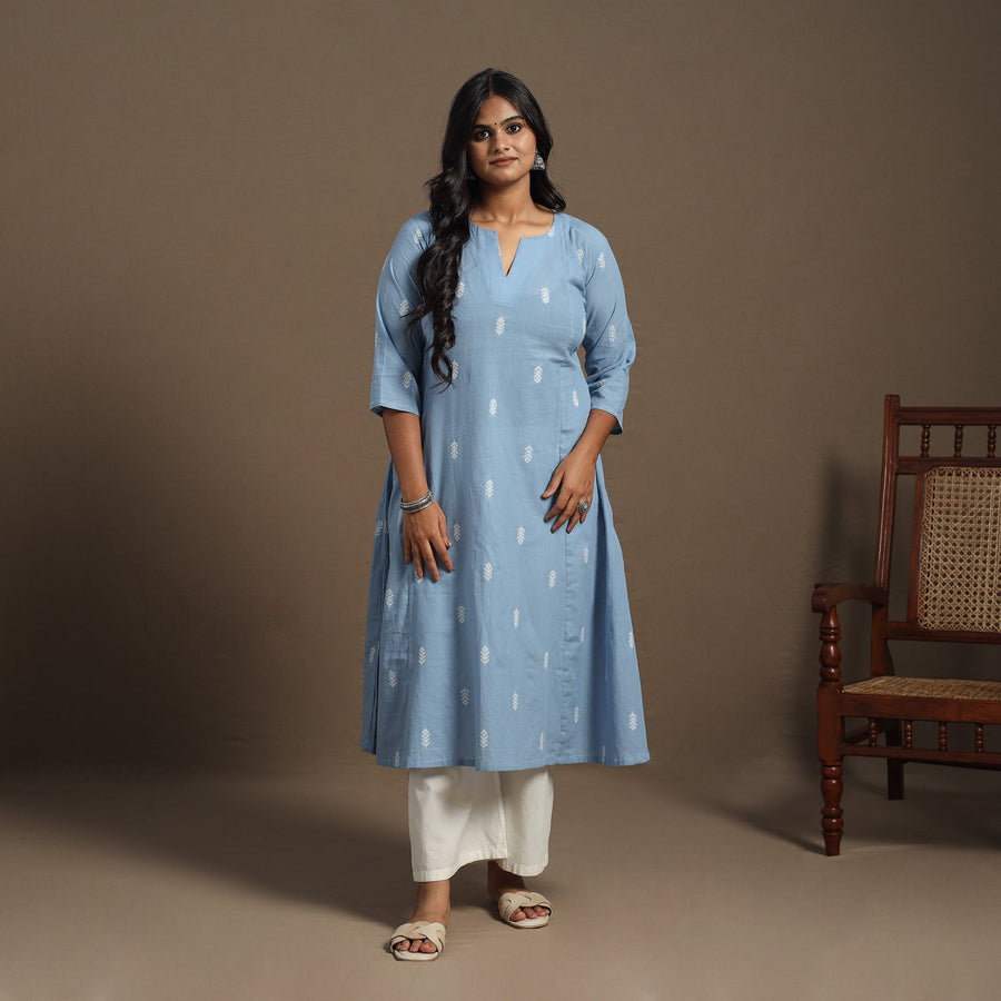 Elevate your everyday look with this blue A-line cotton jacquard kurta, designed for effortless charm and utility. Jacquard technique weaves elegant patterns directly into the fabric, adding a soft, tactile texture. Its breathable cotton keeps you at ease even on long workdays. With a handy side pocket for your essentials, this kurta is perfect for casual lunches or laid-back evenings with friends.
