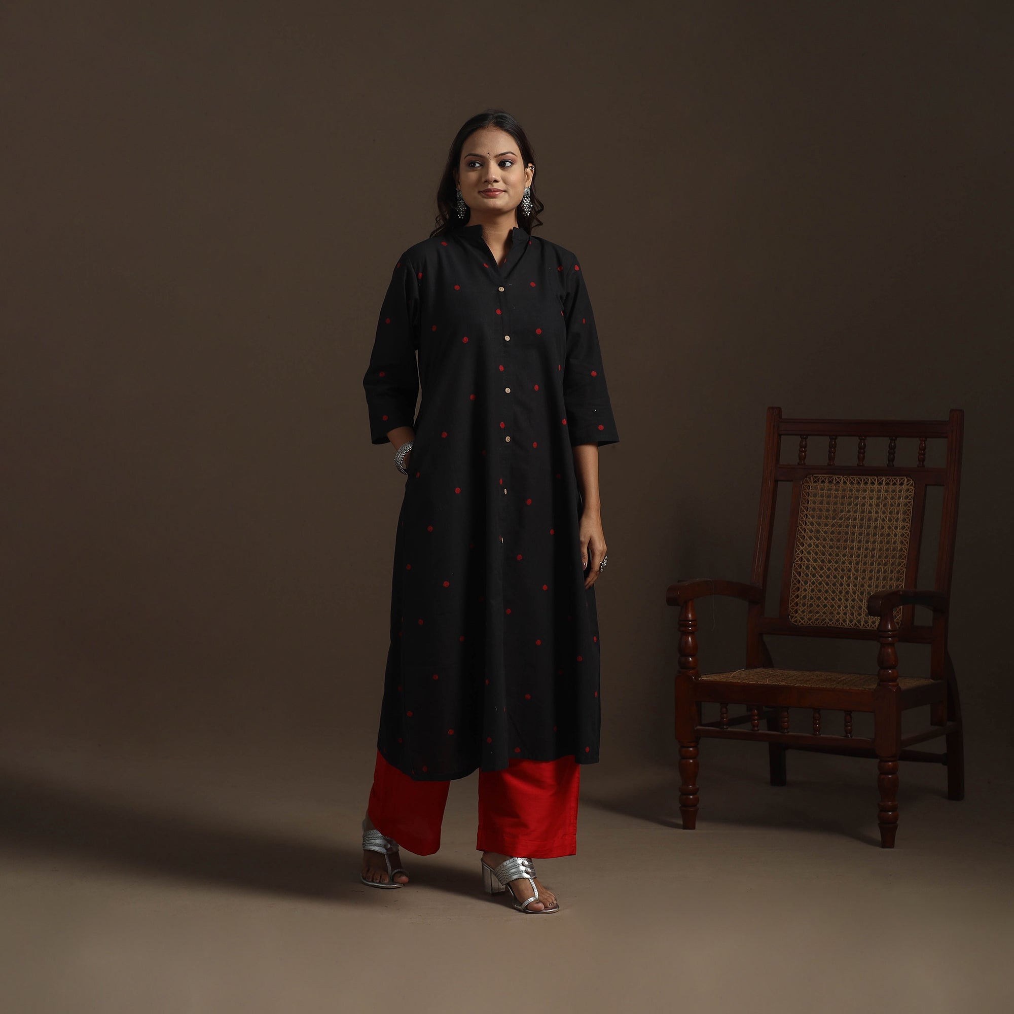 Stay stylish and comfortable in this black A-line cotton jacquard kurta. The jacquard weave embeds patterns directly into the fabric, adding a soft texture you can both see and feel. Designed with a convenient side pocket for your essentials, this kurta is perfect for office wear or a relaxed day out.