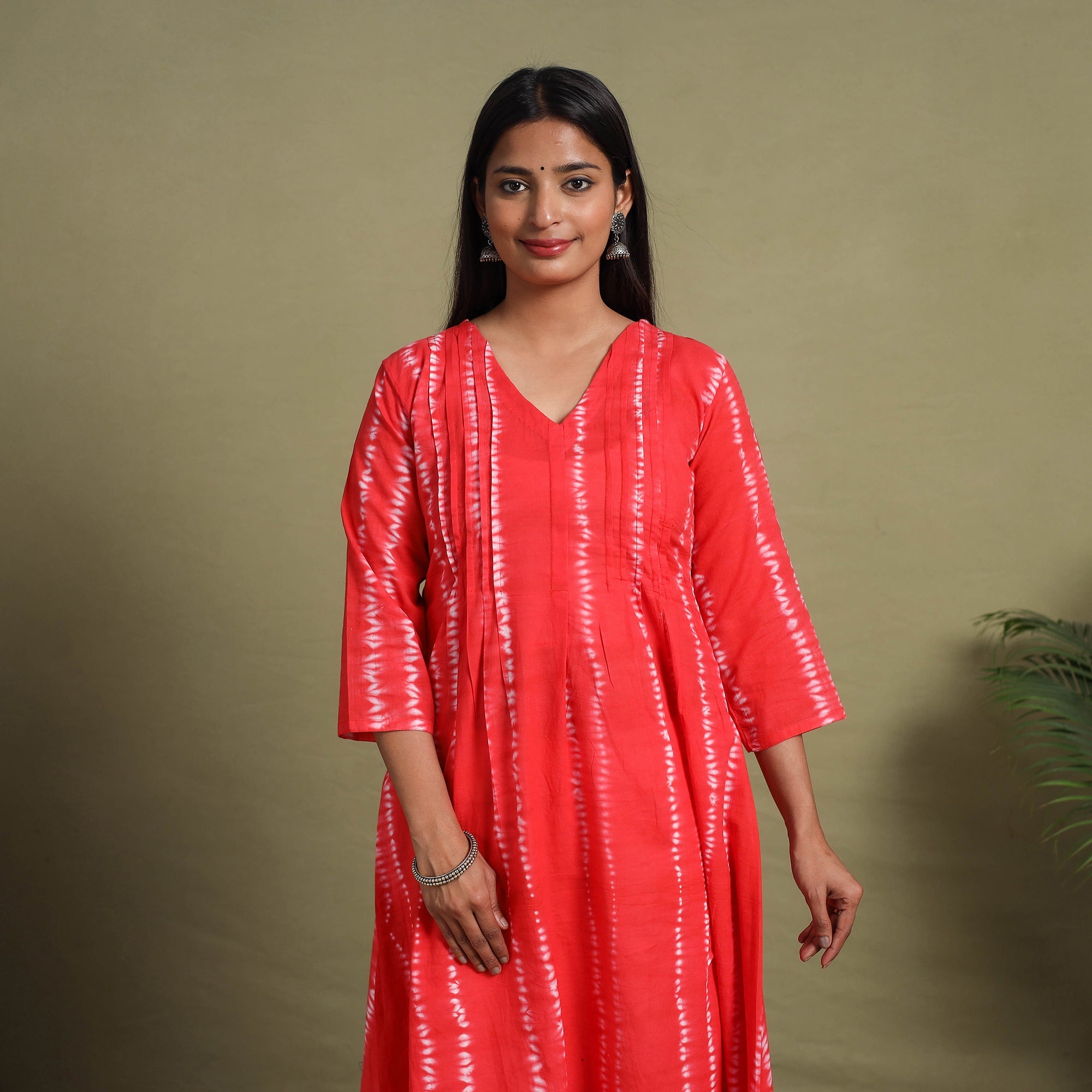 Elevate your everyday wardrobe with this exquisite A-line red shibori cotton kurta. Showcasing a mesmerizing tie & dye pattern, delicate pintuck accents, and a practical side pocket, this kurta is a fusion of tradition and contemporary charm. Whether you're heading to work or a casual brunch, its breathable fabric keeps you comfortable all day.