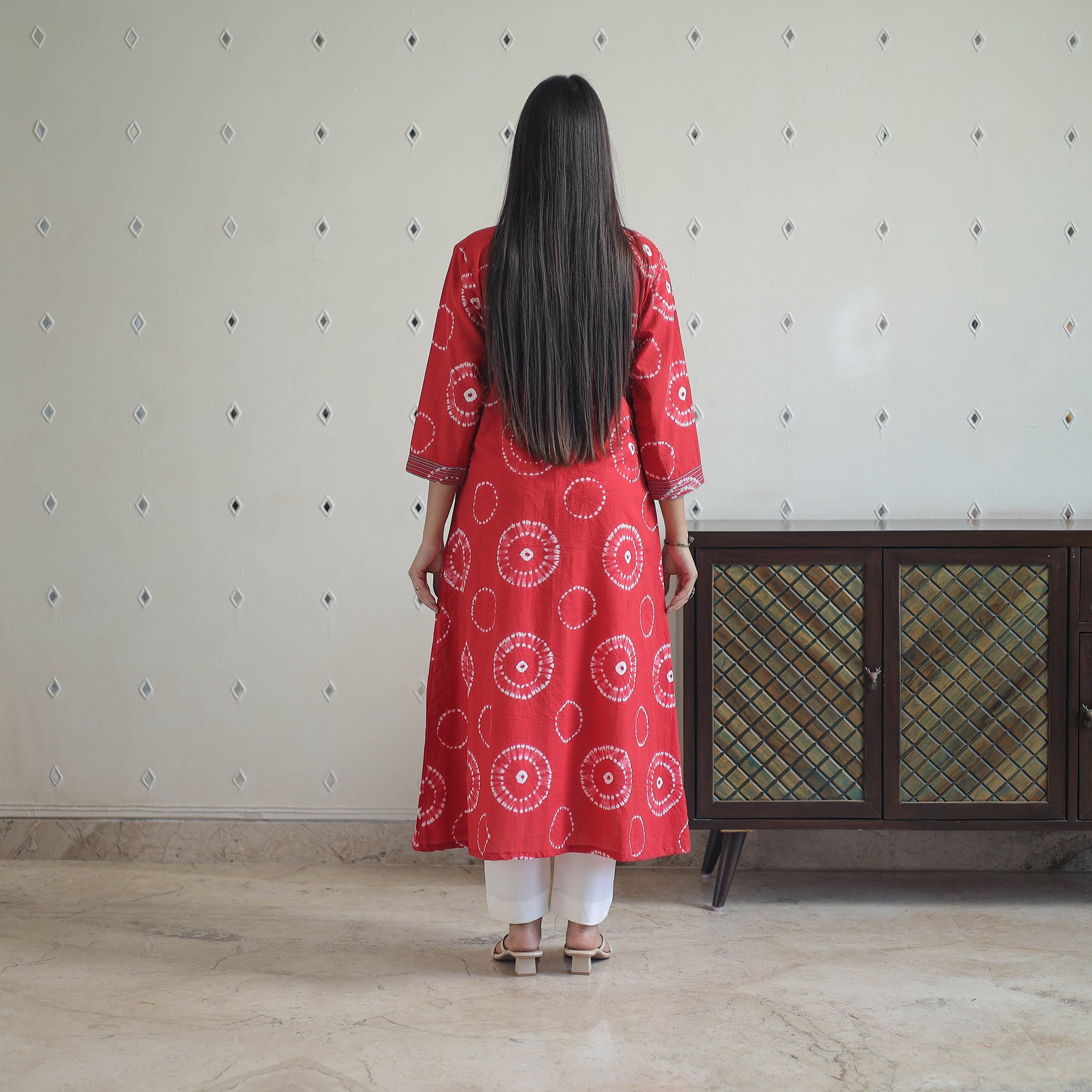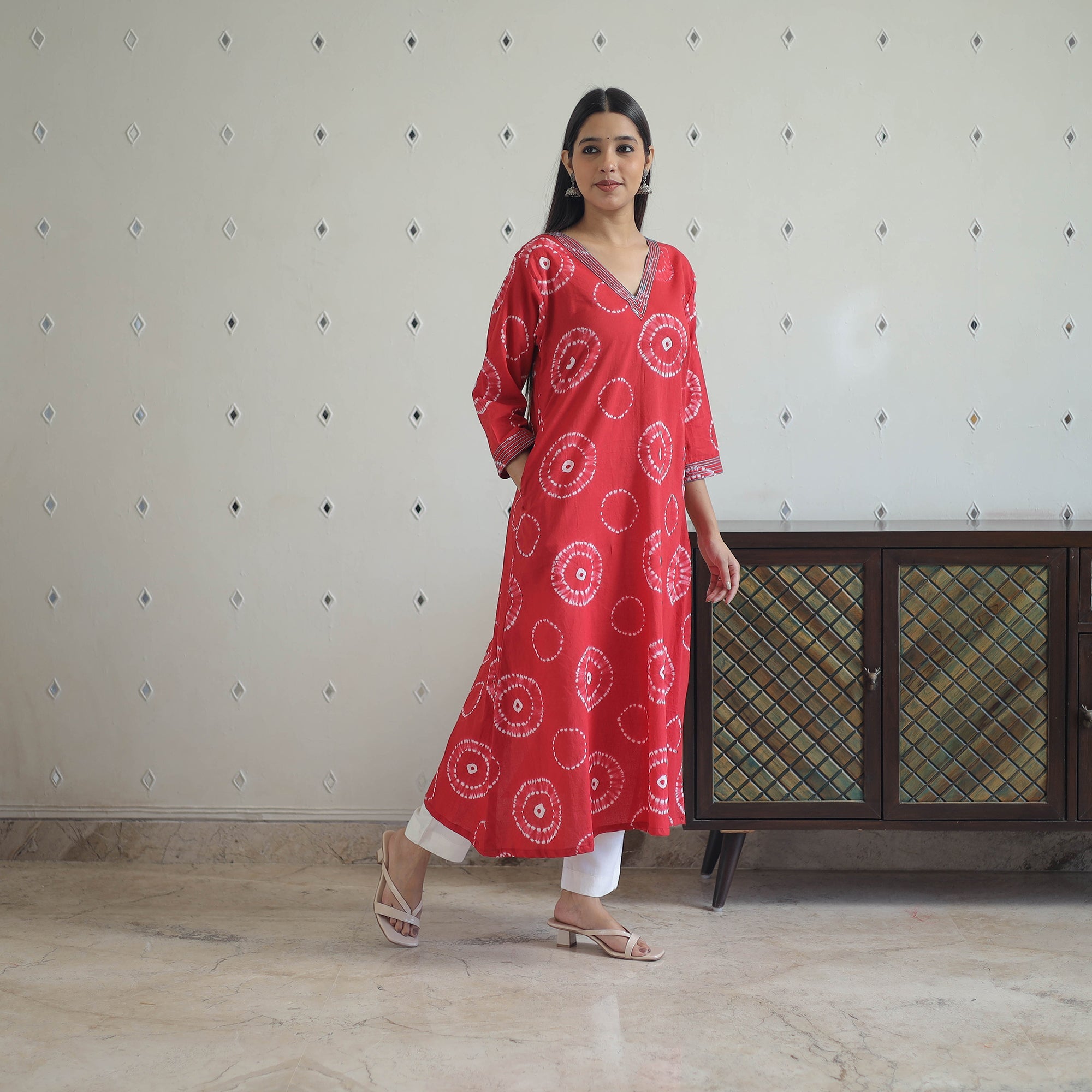 Embrace elegance with this red tie & dye cotton a-line shibori kurta with one side pocket. Featuring a unique pattern created using traditional techniques, this kurta combines comfort with artistic flair. Perfect for all-day wear making it ideal for both casual and semi-formal occasions.