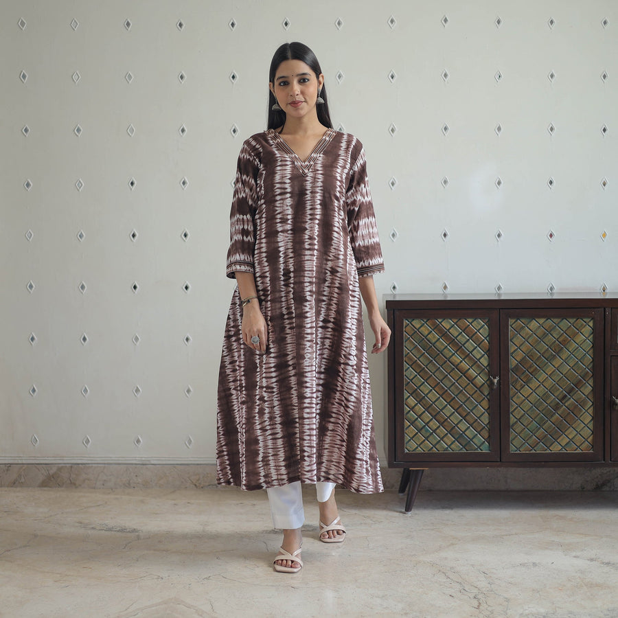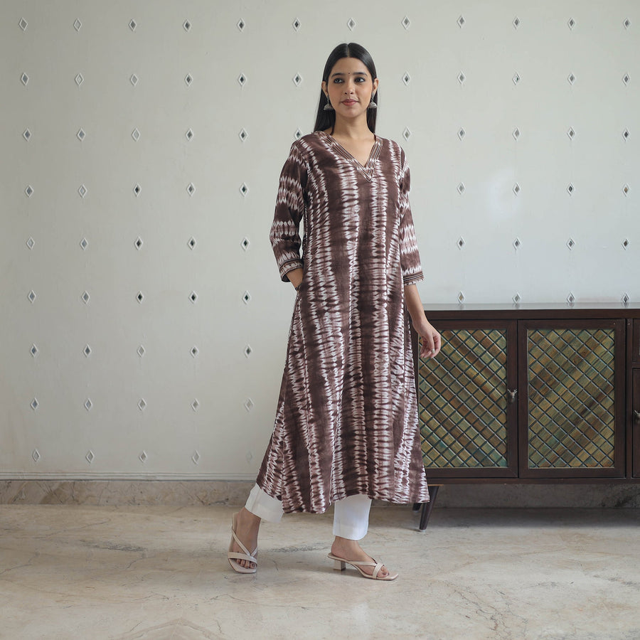 Embrace elegance with this brown tie & dye cotton a-line shibori kurta with one side pocket. Featuring a unique pattern created using traditional techniques, this kurta combines comfort with artistic flair. Perfect for all-day wear making it ideal for both casual and semi-formal occasions.