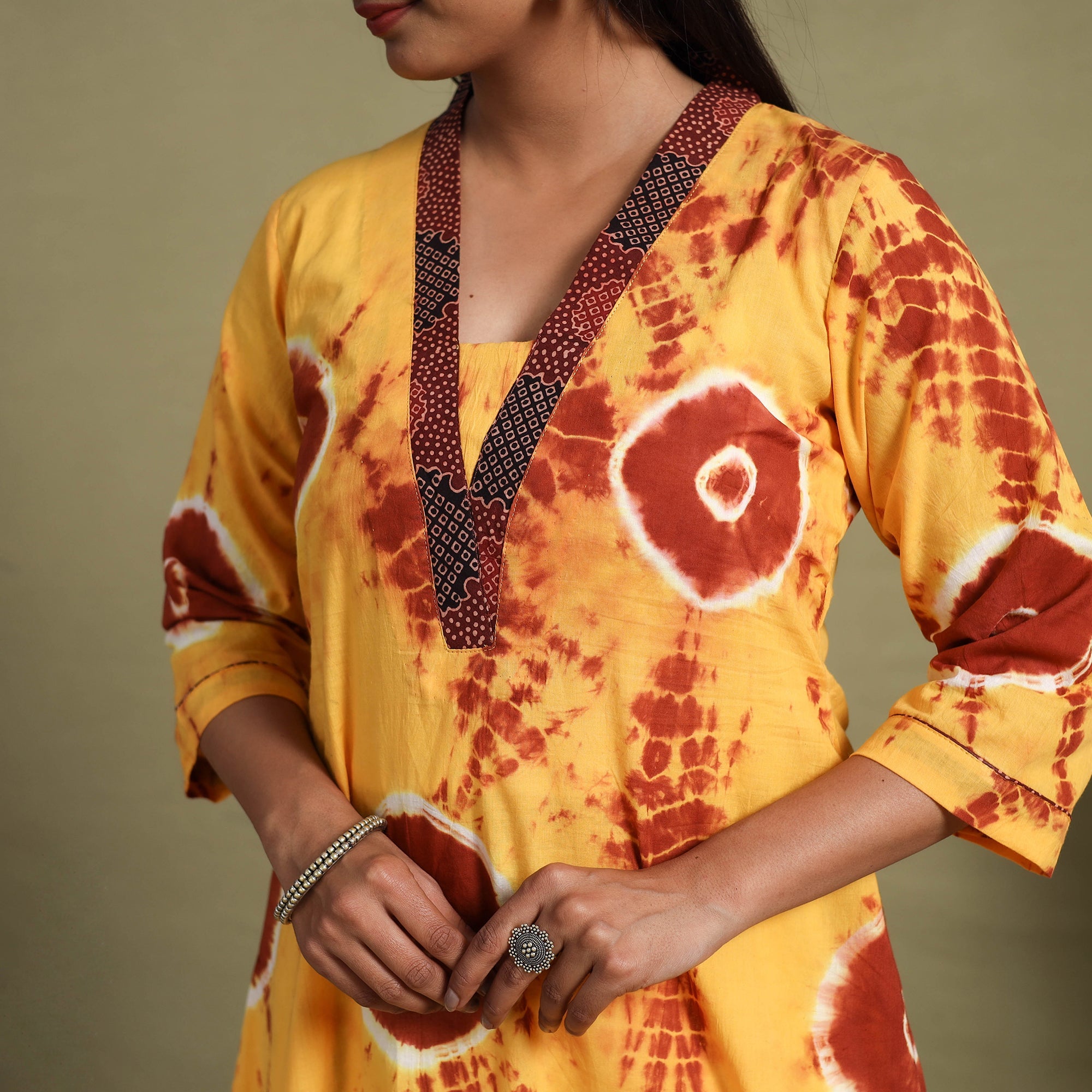 Step into effortless elegance with this beautifully crafted A-line orange shibori cotton kurta, hand-dyed using the traditional tie-and-dye technique. Featuring a convenient side pocket, this kurta blends style with functionality. Made from breathable cotton, it ensures all day comfort, making it a perfect choice for casual outings, office wear, or festive occasions.
