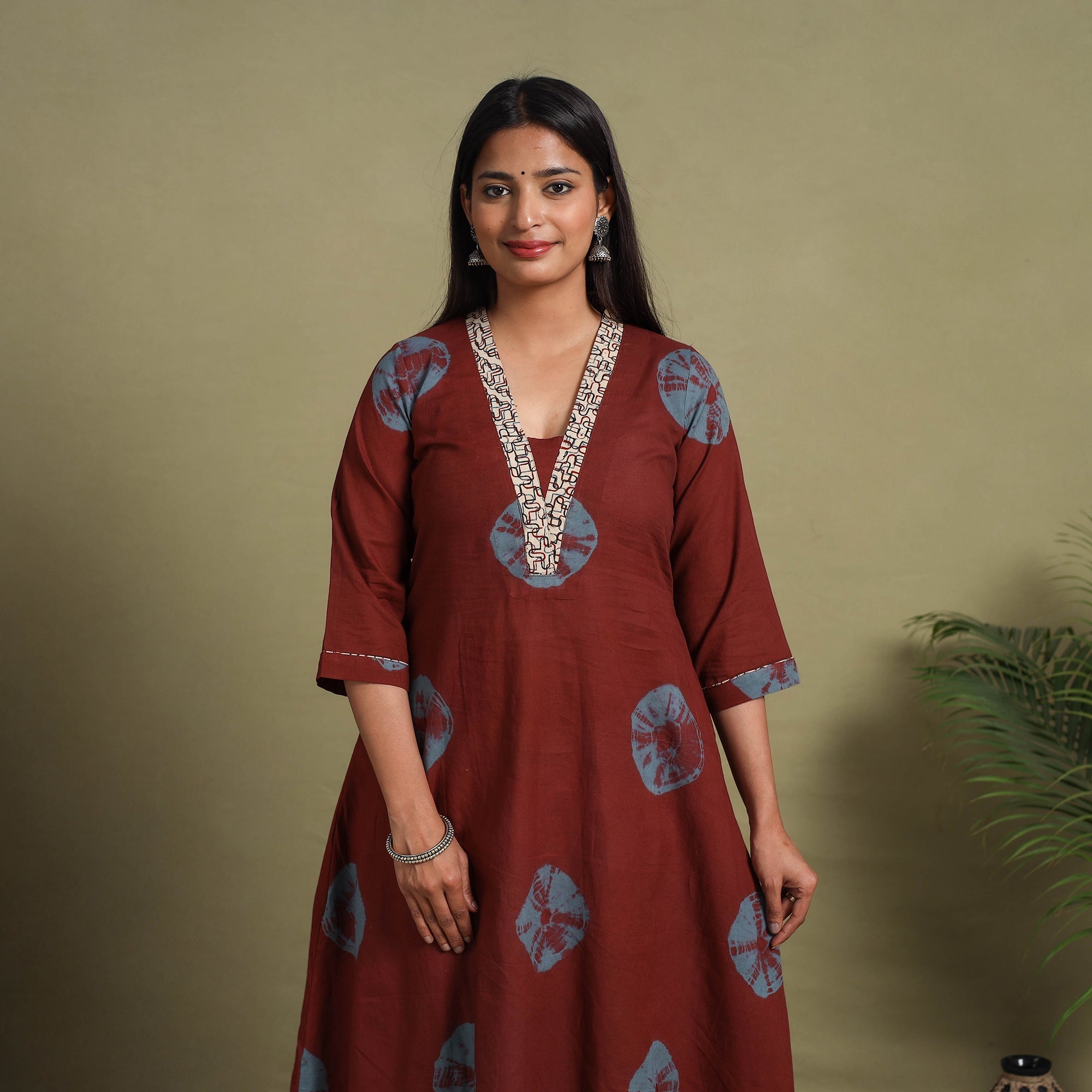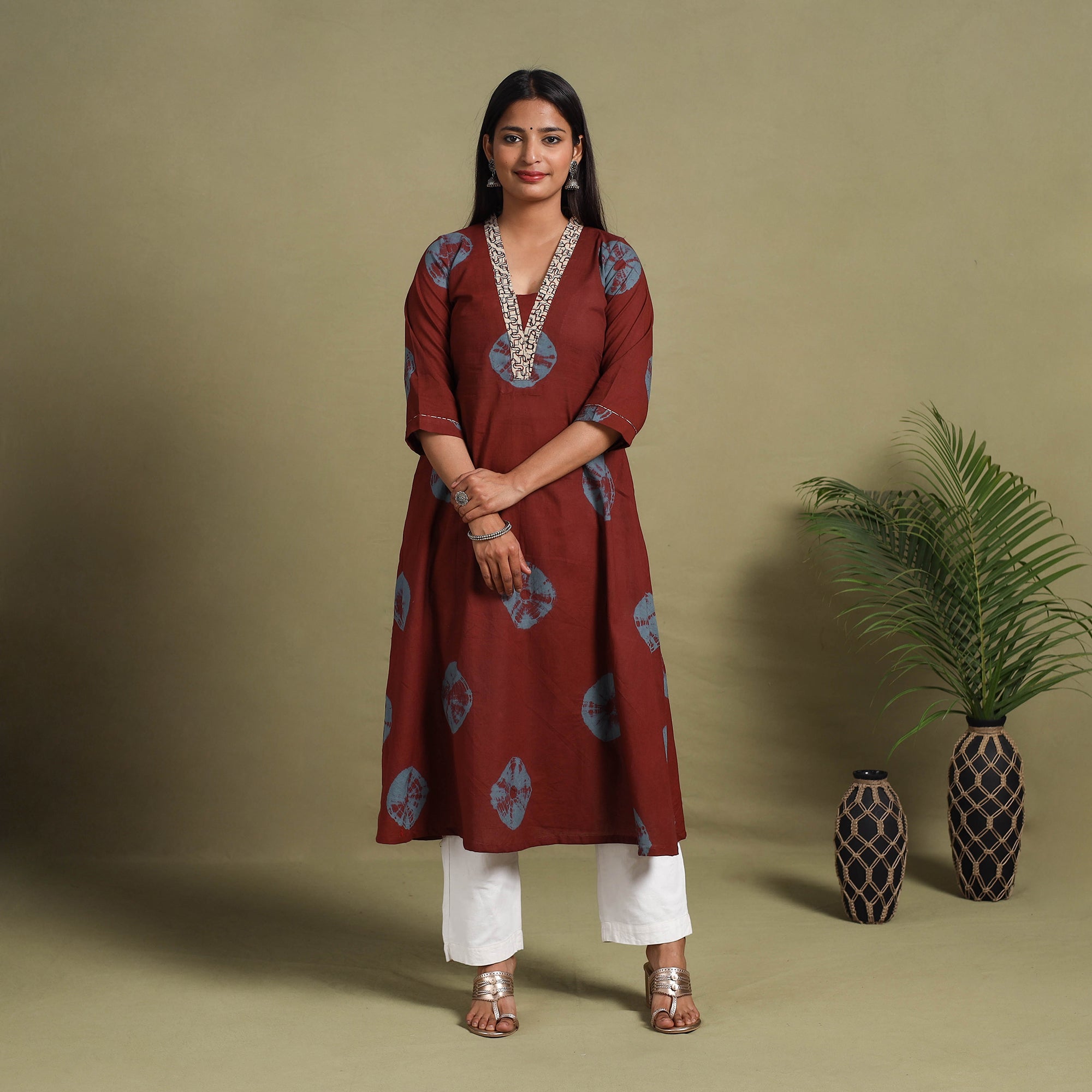 Step into effortless elegance with this beautifully crafted A-line maroon shibori cotton kurta, hand-dyed using the traditional tie-and-dye technique. Featuring a convenient side pocket, this kurta blends style with functionality. Made from breathable cotton, it ensures all day comfort, making it a perfect choice for casual outings, office wear, or festive occasions.