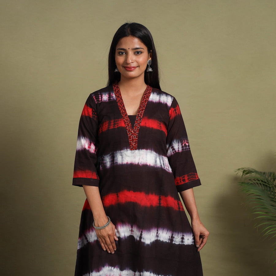 Step into effortless elegance with this beautifully crafted A-line dark brown shibori cotton kurta, hand-dyed using the traditional tie-and-dye technique. Featuring a convenient side pocket, this kurta blends style with functionality. Made from breathable cotton, it ensures all day comfort, making it a perfect choice for casual outings, office wear, or festive occasions.
