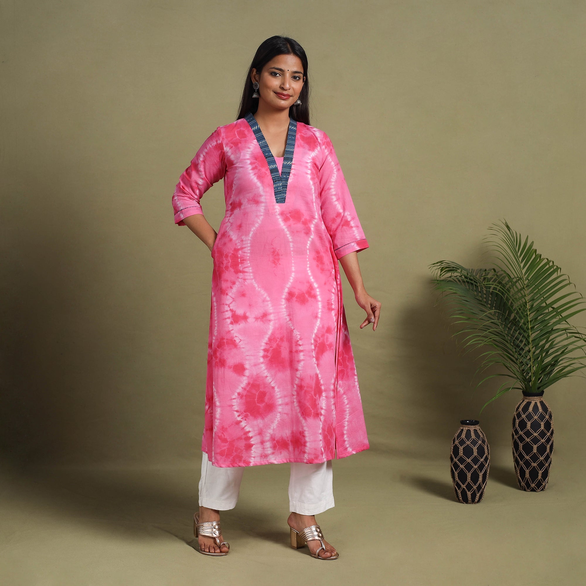 Step into effortless elegance with this beautifully crafted A-line pink shibori cotton kurta, hand-dyed using the traditional tie-and-dye technique. Featuring a convenient side pocket, this kurta blends style with functionality. Made from breathable cotton, it ensures all day comfort, making it a perfect choice for casual outings, office wear, or festive occasions.