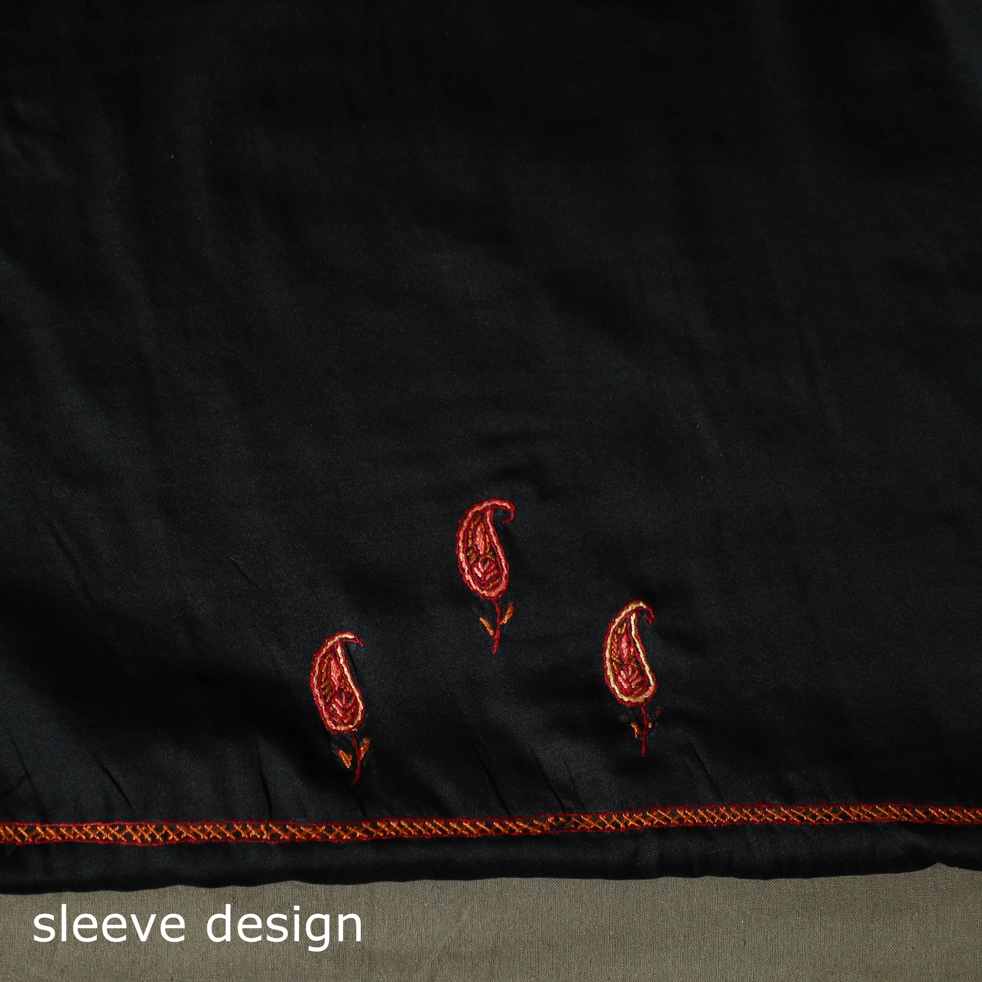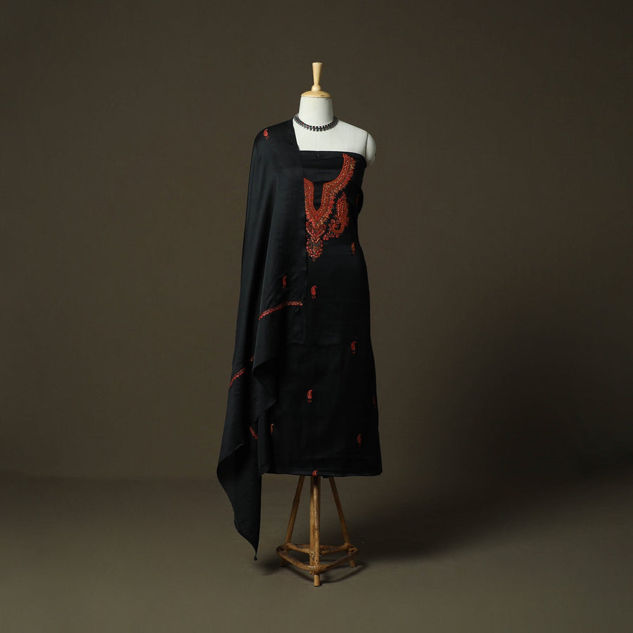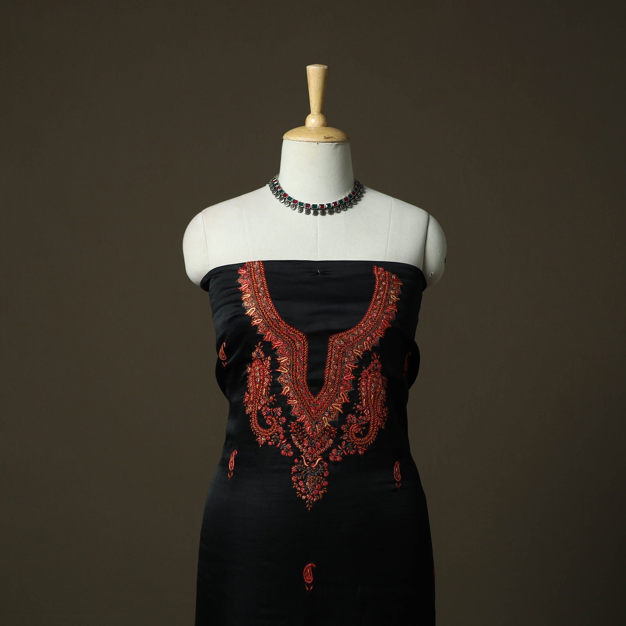 Aari work sozni hand embroidery silk 3pc unstitched dress material is crafted by artisan Nakeeb, reflecting the age-old kashmiri tradition. Known for its fine needlework, sozni embroidery creates detailed floral and paisley patterns with precision, while aari work adds depth and texture through its distinctive hooked needle technique. The set includes kurta fabric, bottom fabric and matching dupatta, making it suitable for weddings, gatherings, and cultural occasions.