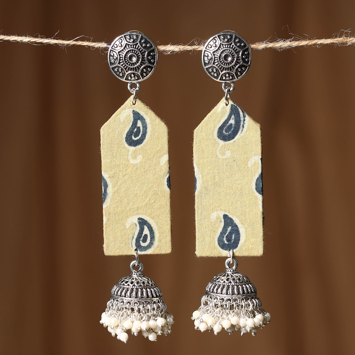 Add a unique flair to your outfit with these yellow handmade fabric earrings. A German silver jhumki is attached at the end, adorned with beads that enhance its charm. Perfect for everyday wear or special occasions, these earrings blend traditional style with a playful touch.