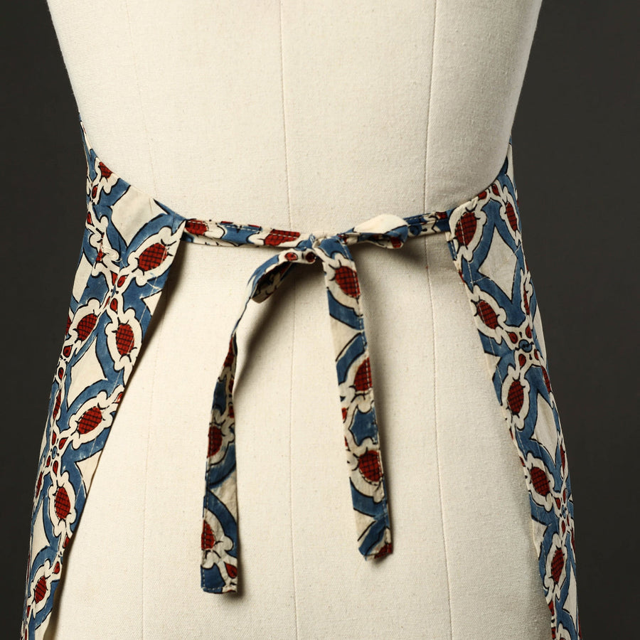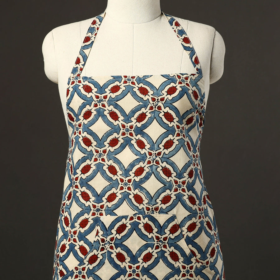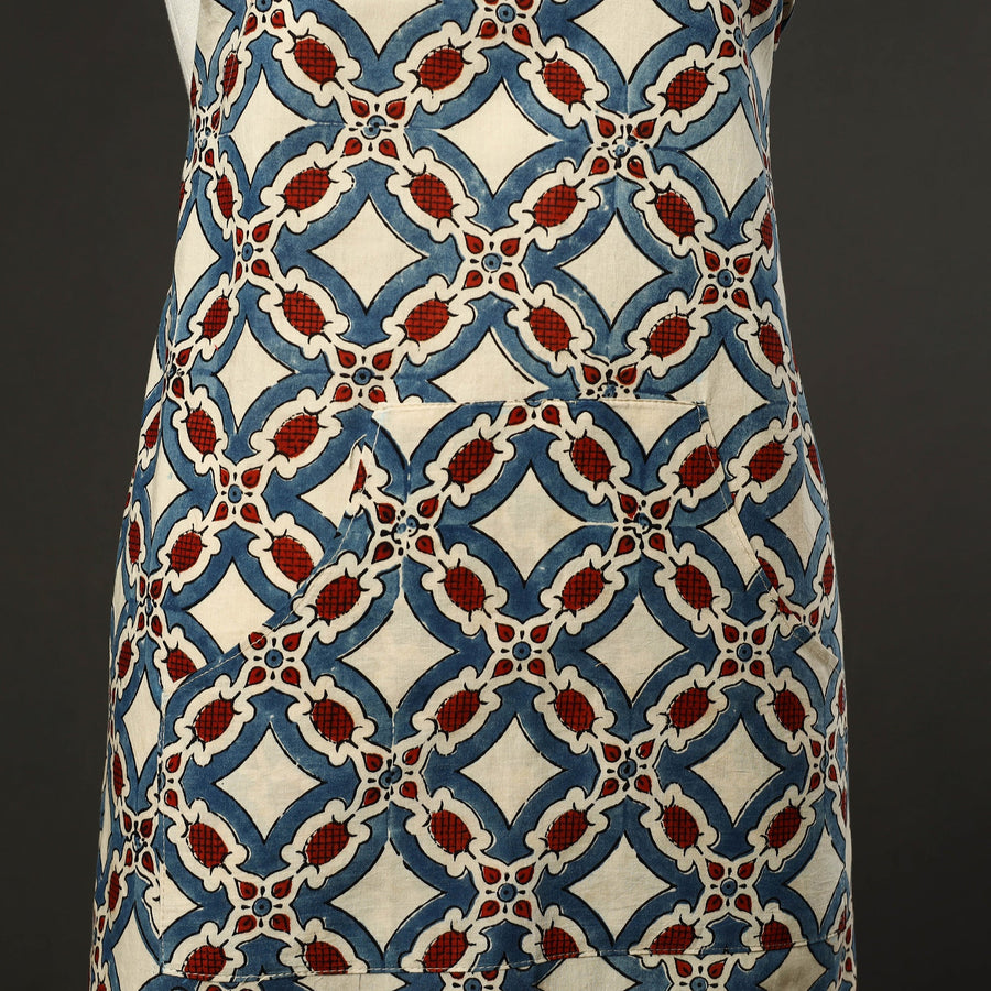 This beige ajrakh print cotton apron with pocket, crafted with traditional ajrakh block printing, combines cultural artistry with everyday functionality. Adorned with ajrakh prints, it features a convenient front pocket and adjustable straps for a comfortable fit. Perfect for cooking, baking, or grilling, this apron adds style and convenience to your kitchen essentials.