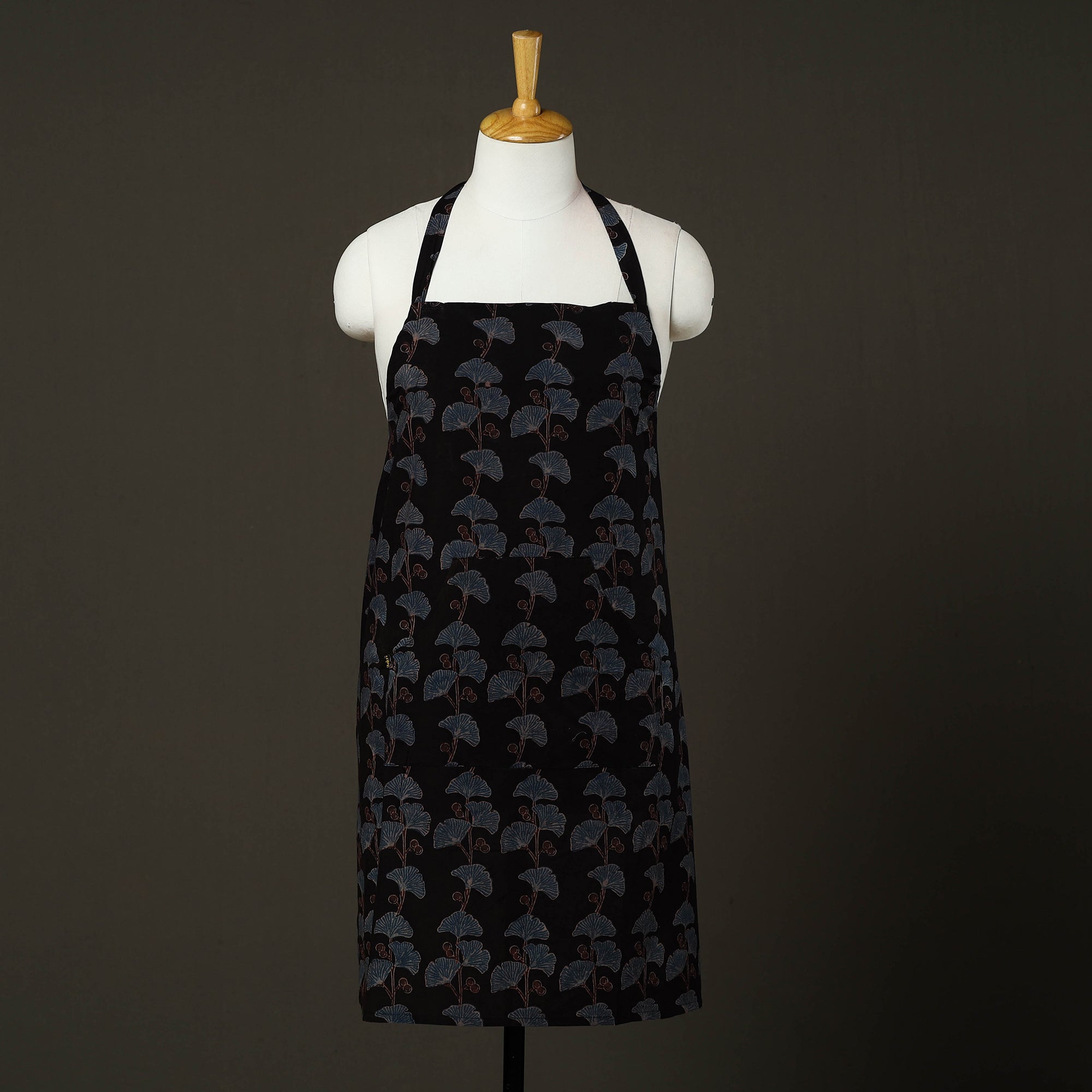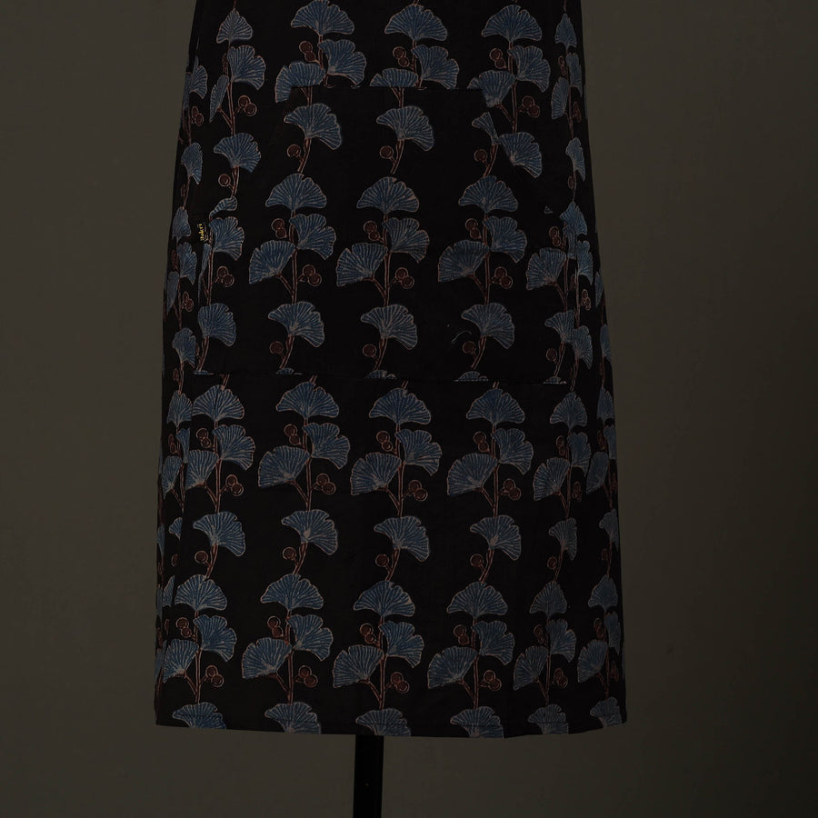 Upgrade your kitchen style with this black ajrakh block print cotton apron with pocket, featuring traditional hand-block printing techniques from kutch. Made from soft, breathable cotton, it is lightweight. Designed to protect your clothing from splashes and spills, this handmade kitchen apron offers an adjustable neck strap and a front pocket for added convenience, making it ideal for daily cooking and baking.