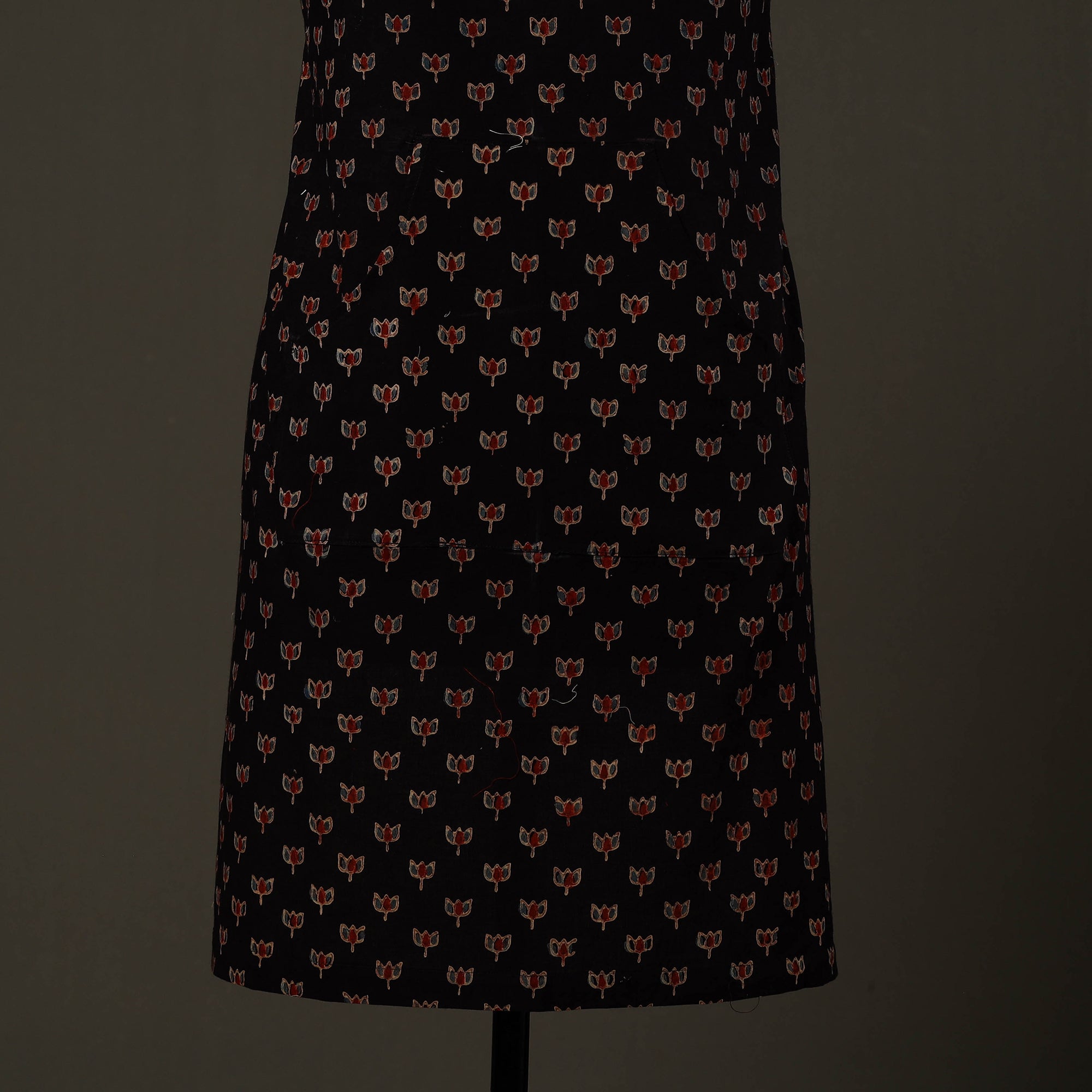 Upgrade your kitchen style with this black ajrakh block print cotton apron with pocket, featuring traditional hand-block printing techniques from kutch. Made from soft, breathable cotton, it is lightweight. Designed to protect your clothing from splashes and spills, this handmade kitchen apron offers an adjustable neck strap and a front pocket for added convenience, making it ideal for daily cooking and baking.
