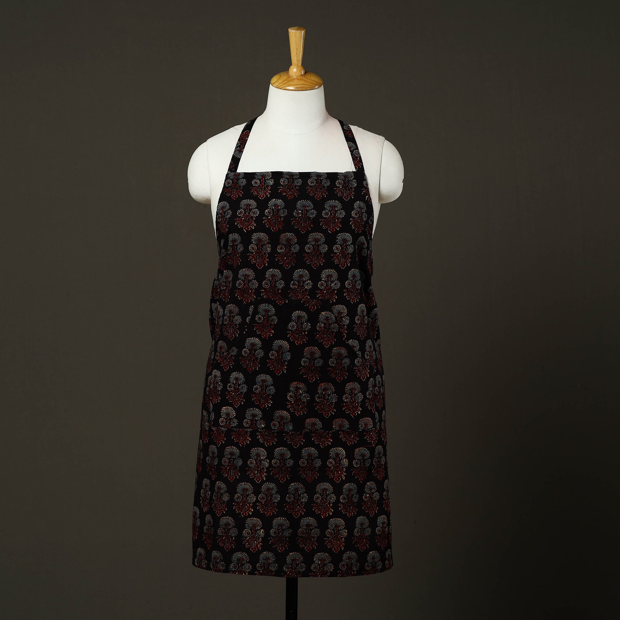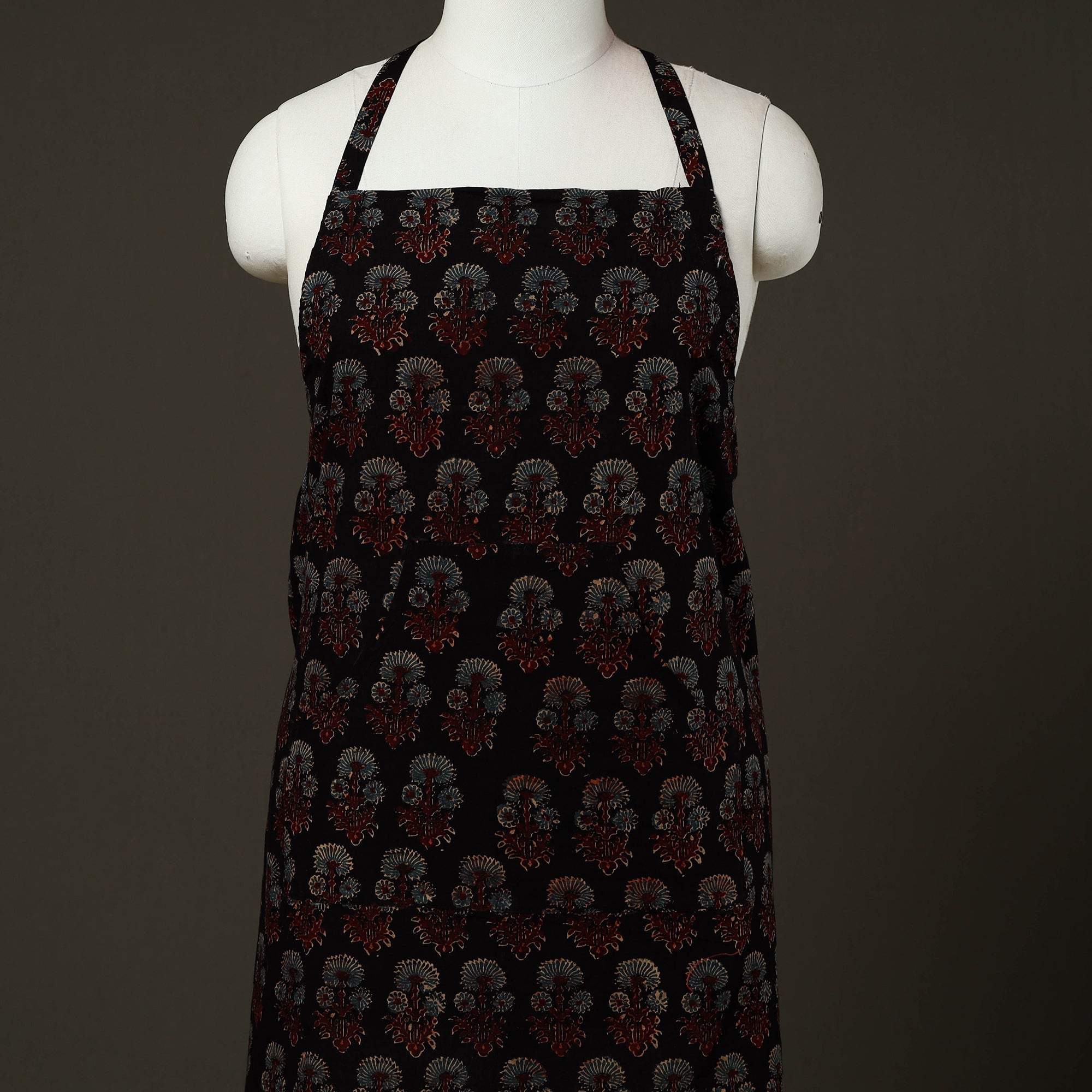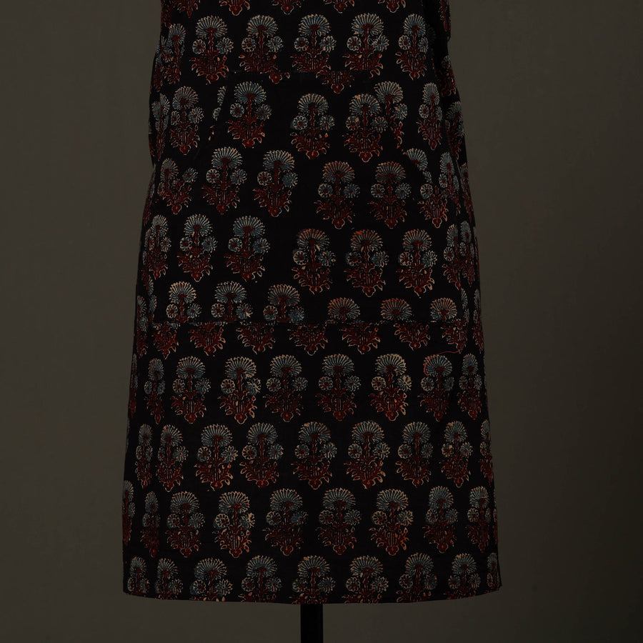 Upgrade your kitchen style with this black ajrakh block print cotton apron with pocket, featuring traditional hand-block printing techniques from kutch. Made from soft, breathable cotton, it is lightweight. Designed to protect your clothing from splashes and spills, this handmade kitchen apron offers an adjustable neck strap and a front pocket for added convenience, making it ideal for daily cooking and baking.