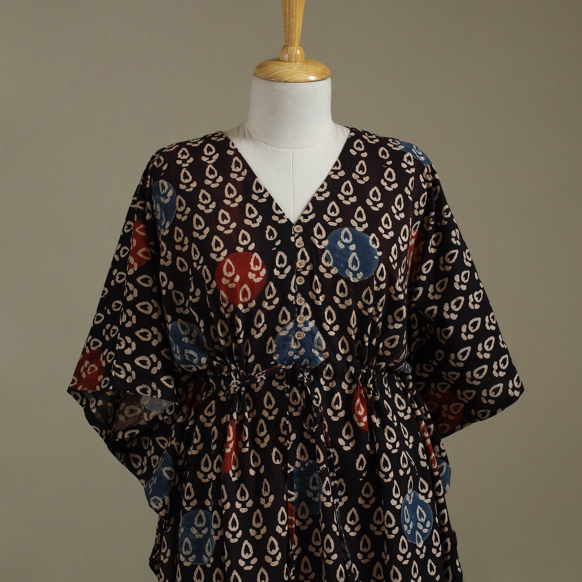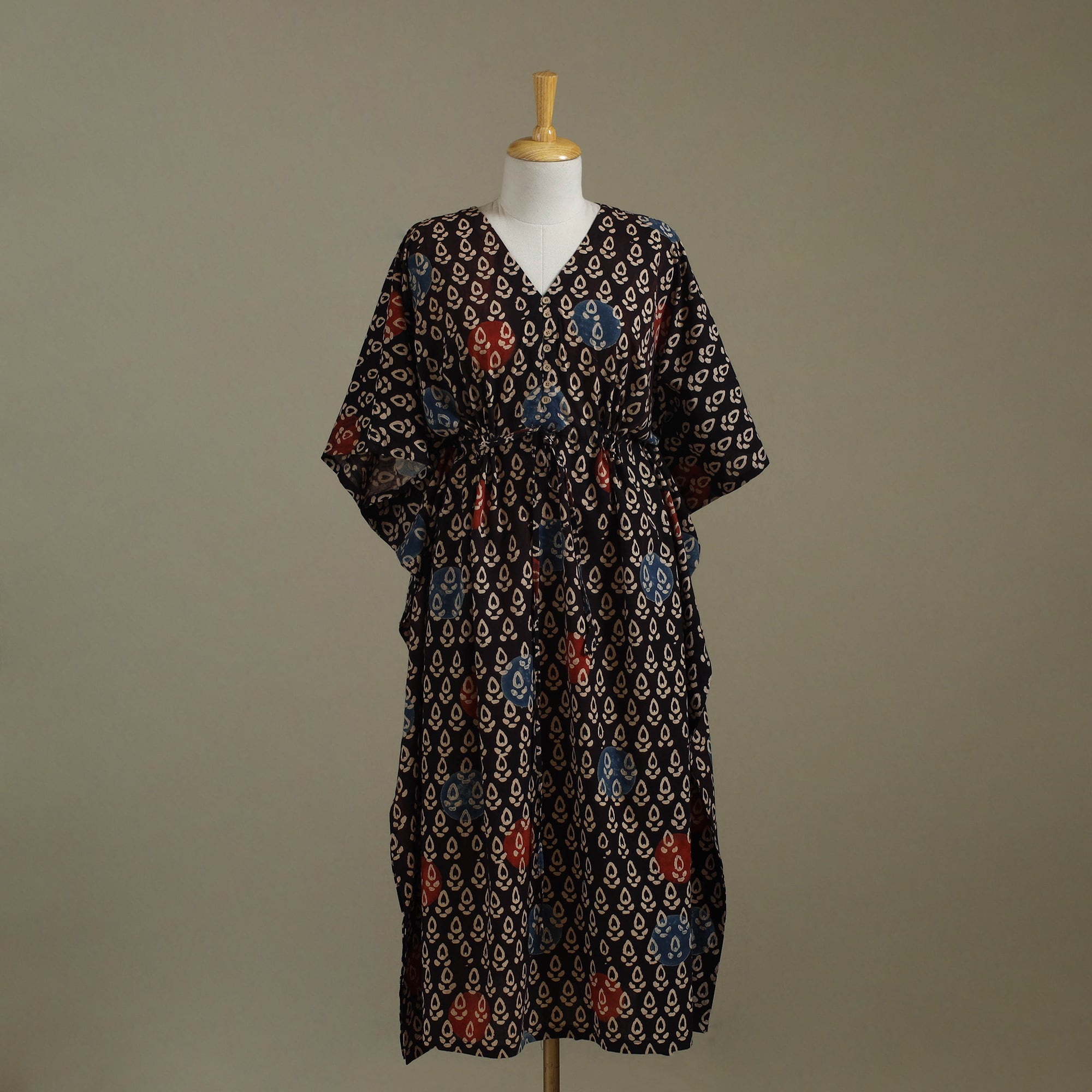 Enjoy effortless comfort in our black ajrakh block print kaftan, crafted from soft, breathable cotton. Featuring timeless motifs in a traditional style, this free-flowing silhouette includes a functional drawstring at the waist for a customizable fit. Whether you're lounging at home or stepping out for a casual brunch, this kaftan delivers easy elegance with all-day comfort.