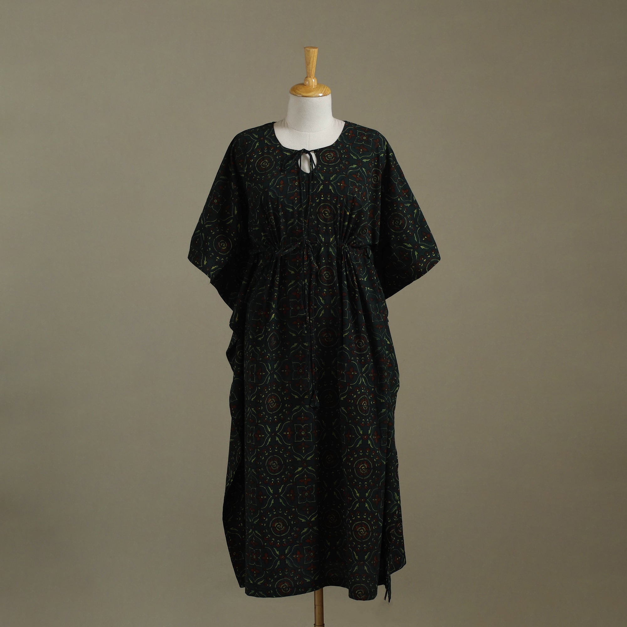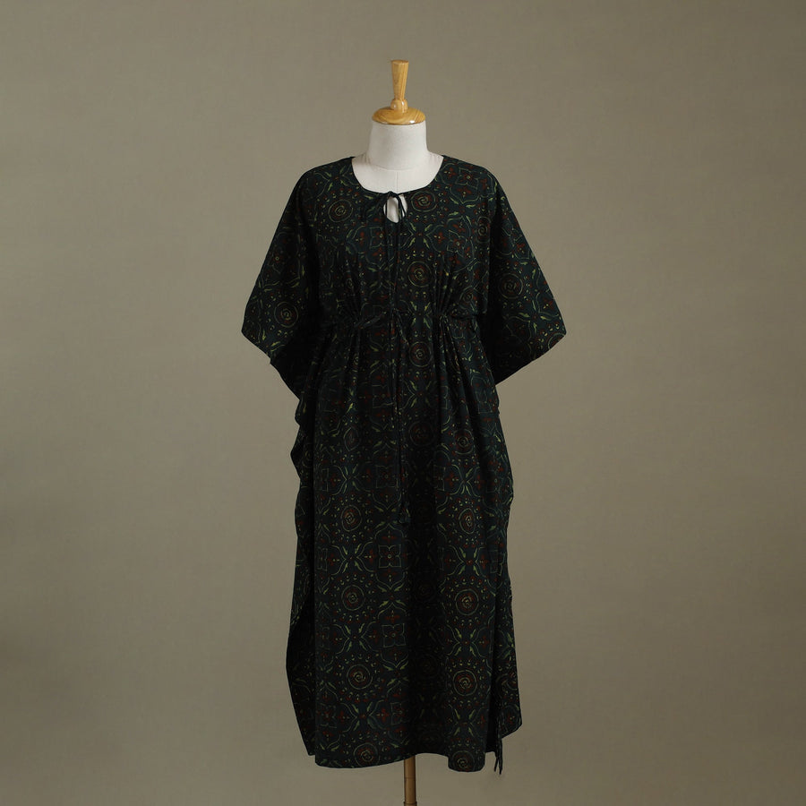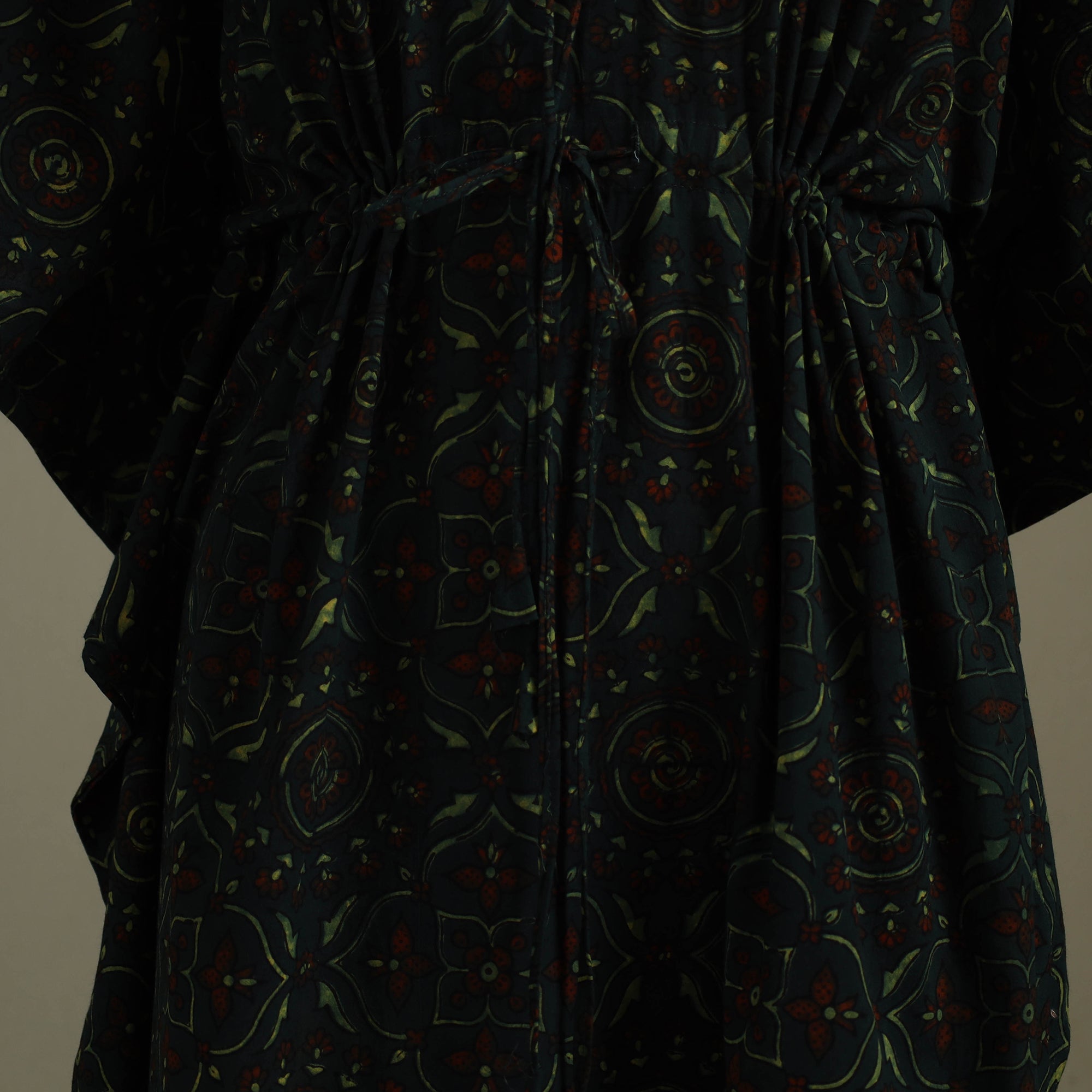 Enjoy effortless comfort in our black ajrakh block print kaftan, crafted from soft, breathable cotton. Featuring timeless motifs in a traditional style, this free-flowing silhouette includes a functional drawstring at the waist for a customizable fit. Whether you're lounging at home or stepping out for a casual brunch, this kaftan delivers easy elegance with all-day comfort.