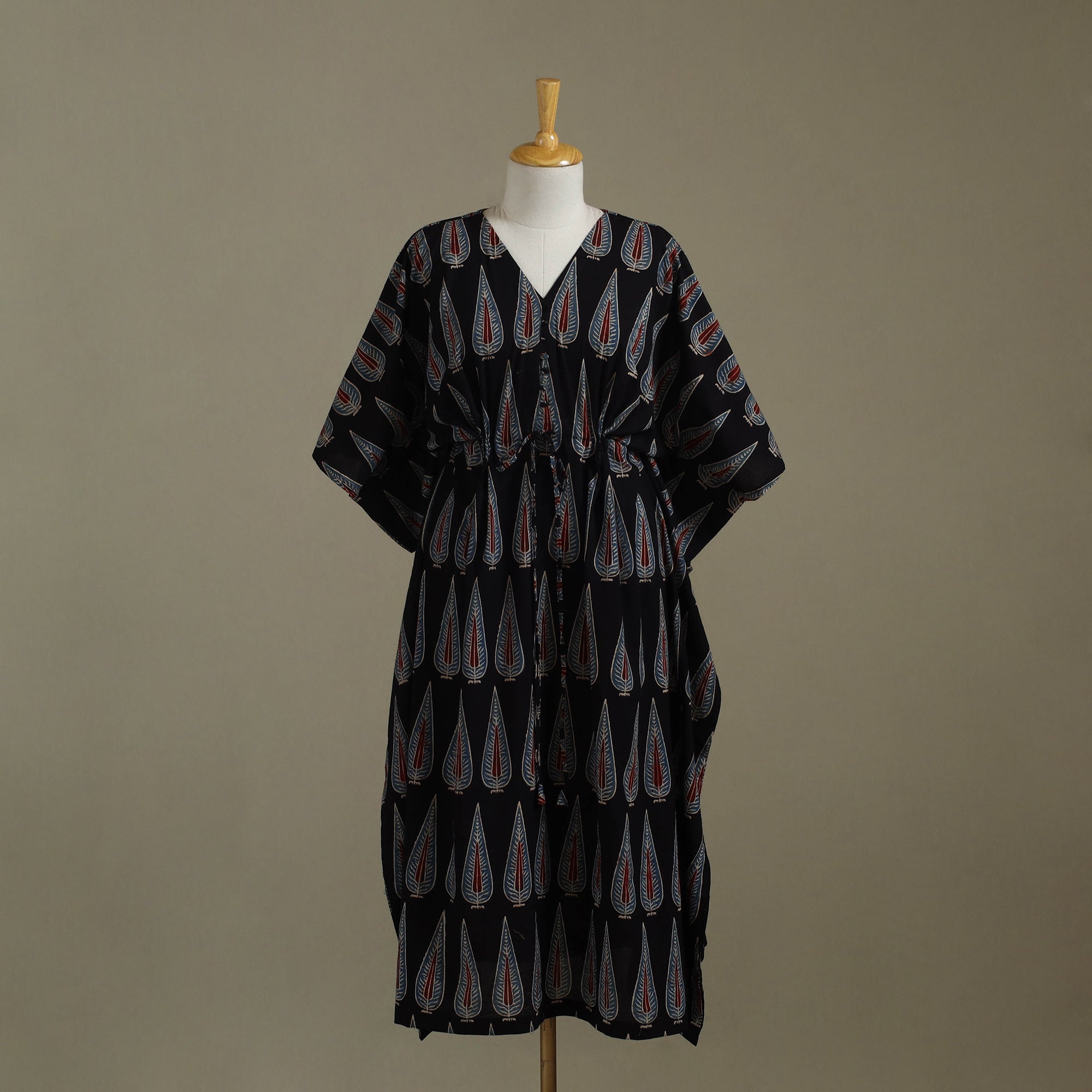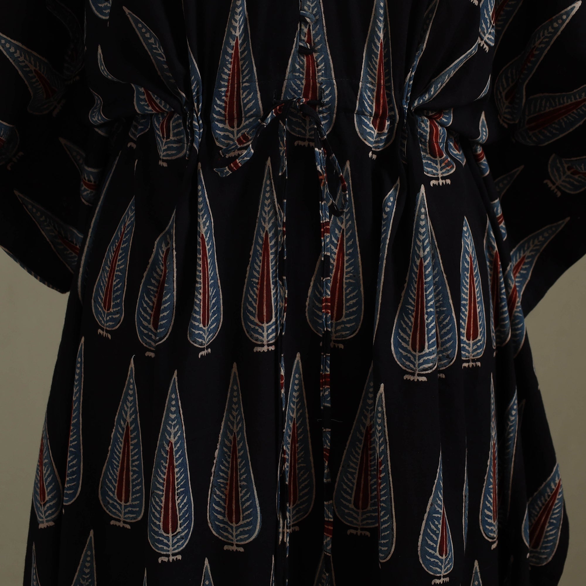 | Material | Enjoy effortless comfort in our black ajrakh block print kaftan, crafted from soft, breathable cotton. Featuring timeless motifs in a traditional style, this free-flowing silhouette includes a functional drawstring at the waist for a customizable fit. Whether you're lounging at home or stepping out for a casual brunch, this kaftan delivers easy elegance with all-day comfort. |
