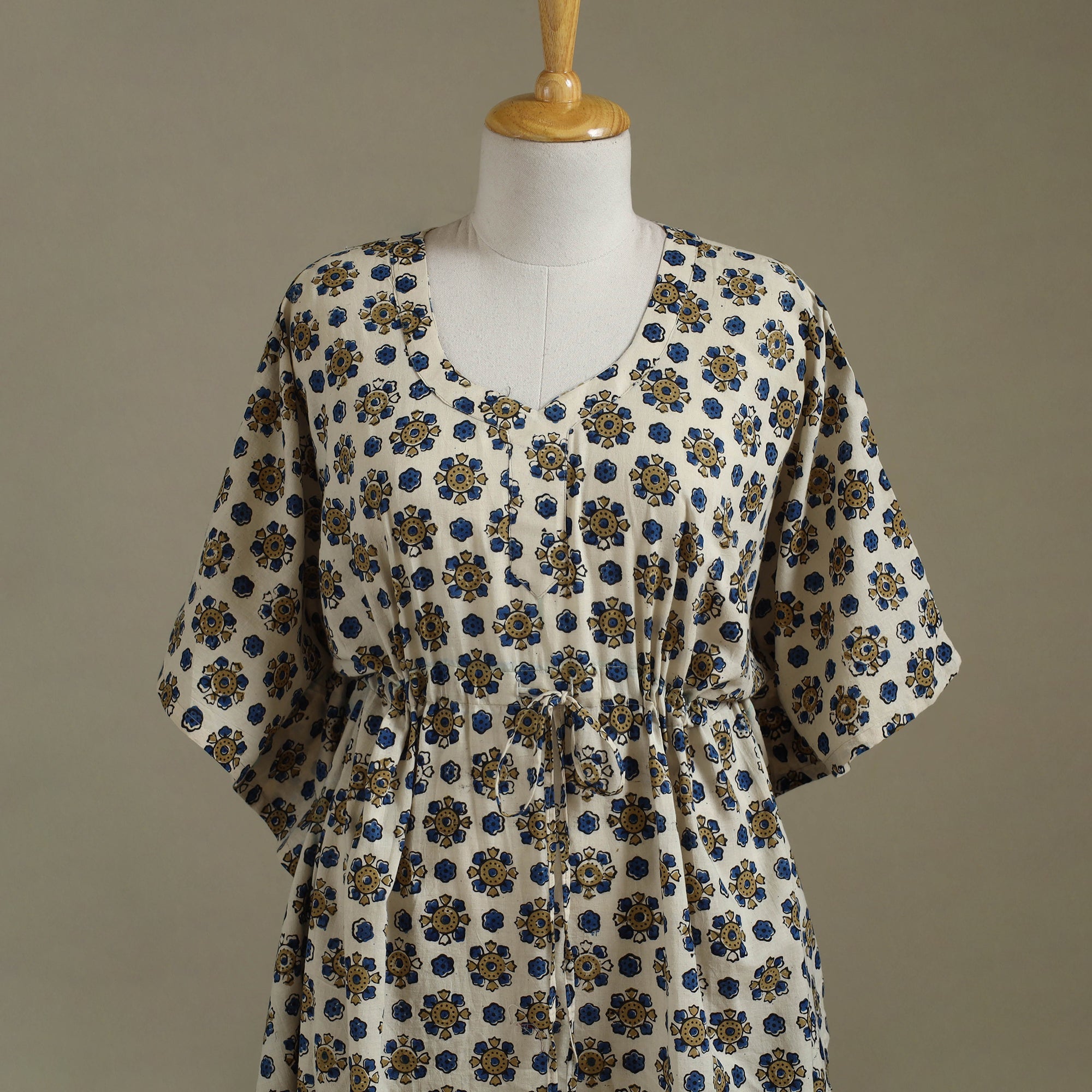 Enjoy effortless comfort in our beige ajrakh block print kaftan, crafted from soft, breathable cotton. Featuring timeless motifs in a traditional style, this free-flowing silhouette includes a functional drawstring at the waist for a customizable fit. Whether you're lounging at home or stepping out for a casual brunch, this kaftan delivers easy elegance with all-day comfort.