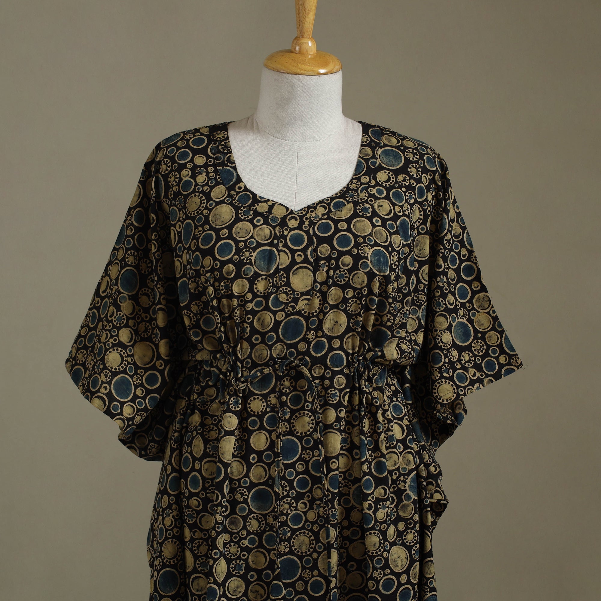 Enjoy effortless comfort in our black ajrakh block print kaftan, crafted from soft, breathable cotton. Featuring timeless motifs in a traditional style, this free-flowing silhouette includes a functional drawstring at the waist for a customizable fit. Whether you're lounging at home or stepping out for a casual brunch, this kaftan delivers easy elegance with all-day comfort.
