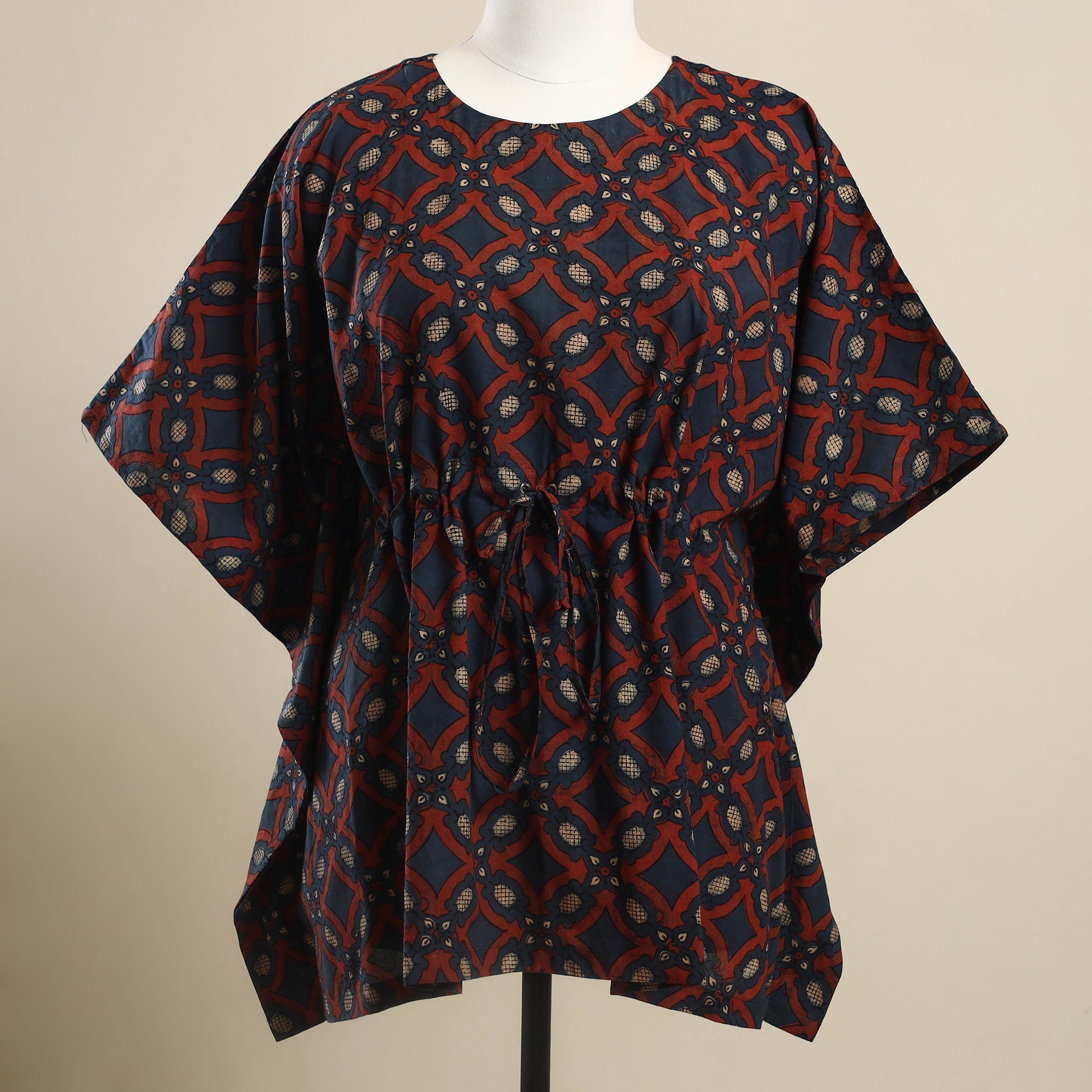 Experience the perfect fusion of tradition and comfort with this blue ajrakh block print cotton kaftan, designed for effortless style. Crafted from breathable cotton, it features intricate ajrakh block prints that add a rich cultural touch. The kaftan drapes gracefully with its relaxed fit, while the adjustable drawstring waist ensures a custom fit perfect for lounging, vacations, or casual day outs.