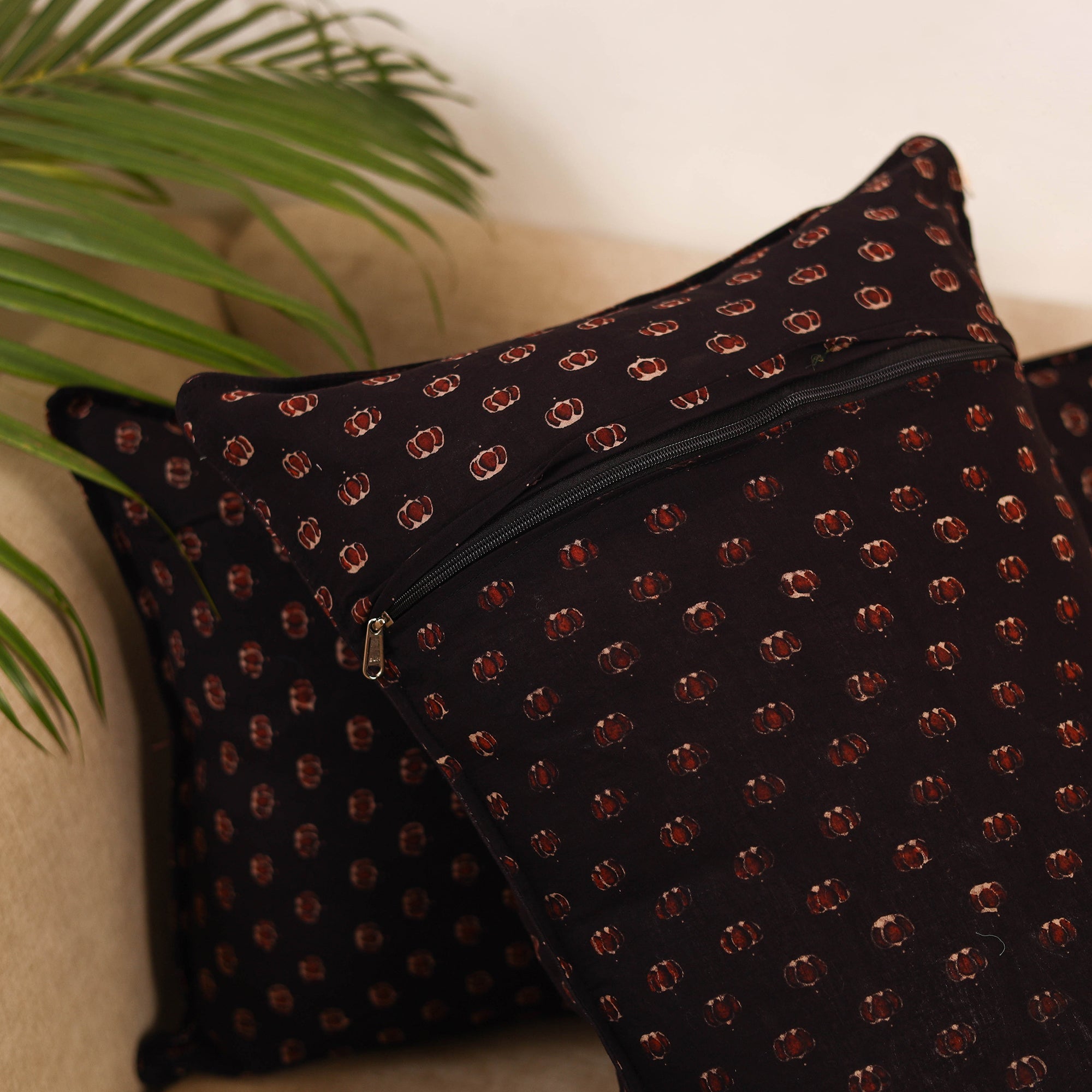 Black ajrakh pillow covers (set of 2) crafted from cotton. These covers feature traditional Ajrakh block printing, where hand-carved wooden blocks create detailed geometric patterns. Ajrakh printing originates from Kutch and follows age-old resist-dye techniques. Perfect for elevating the look of your bedroom.