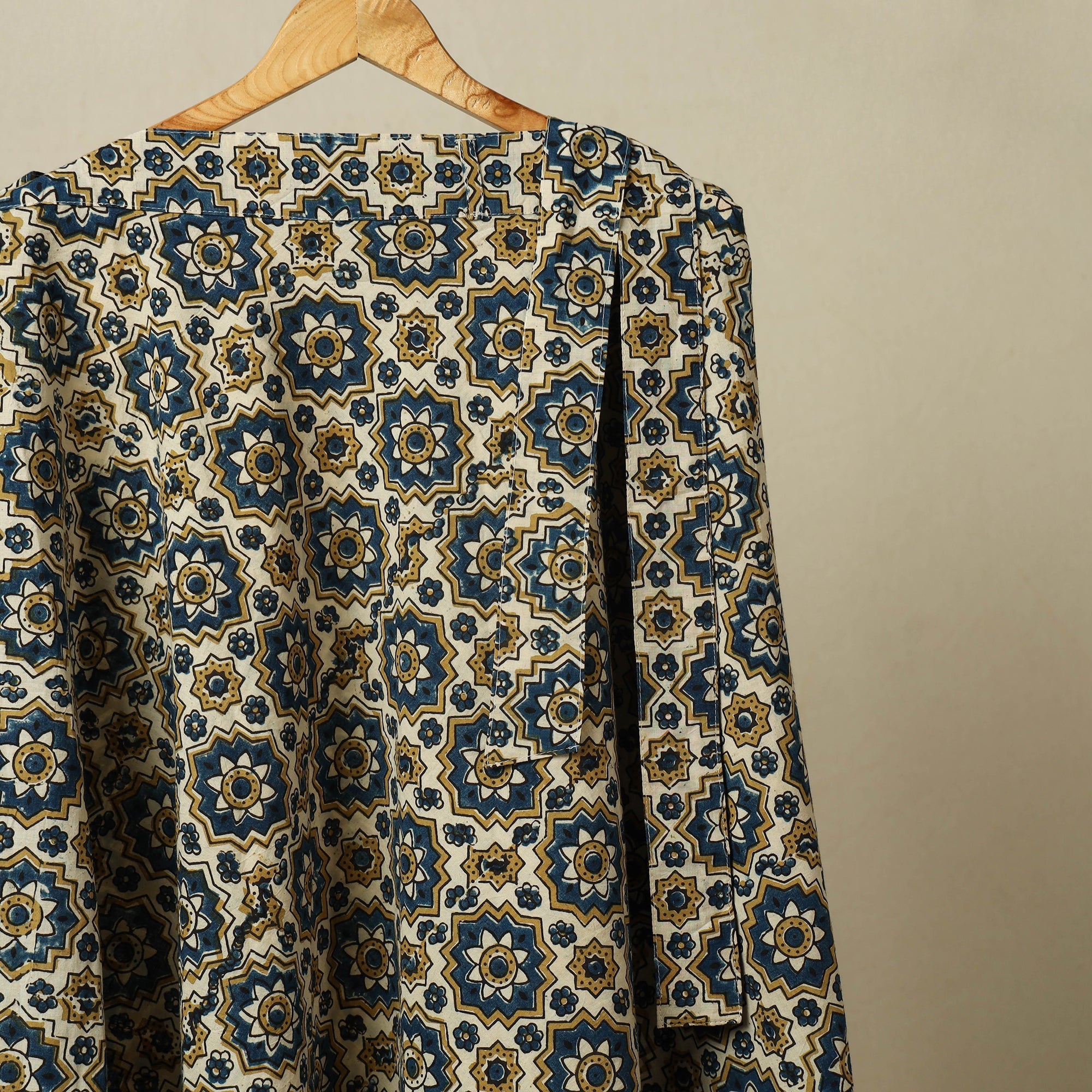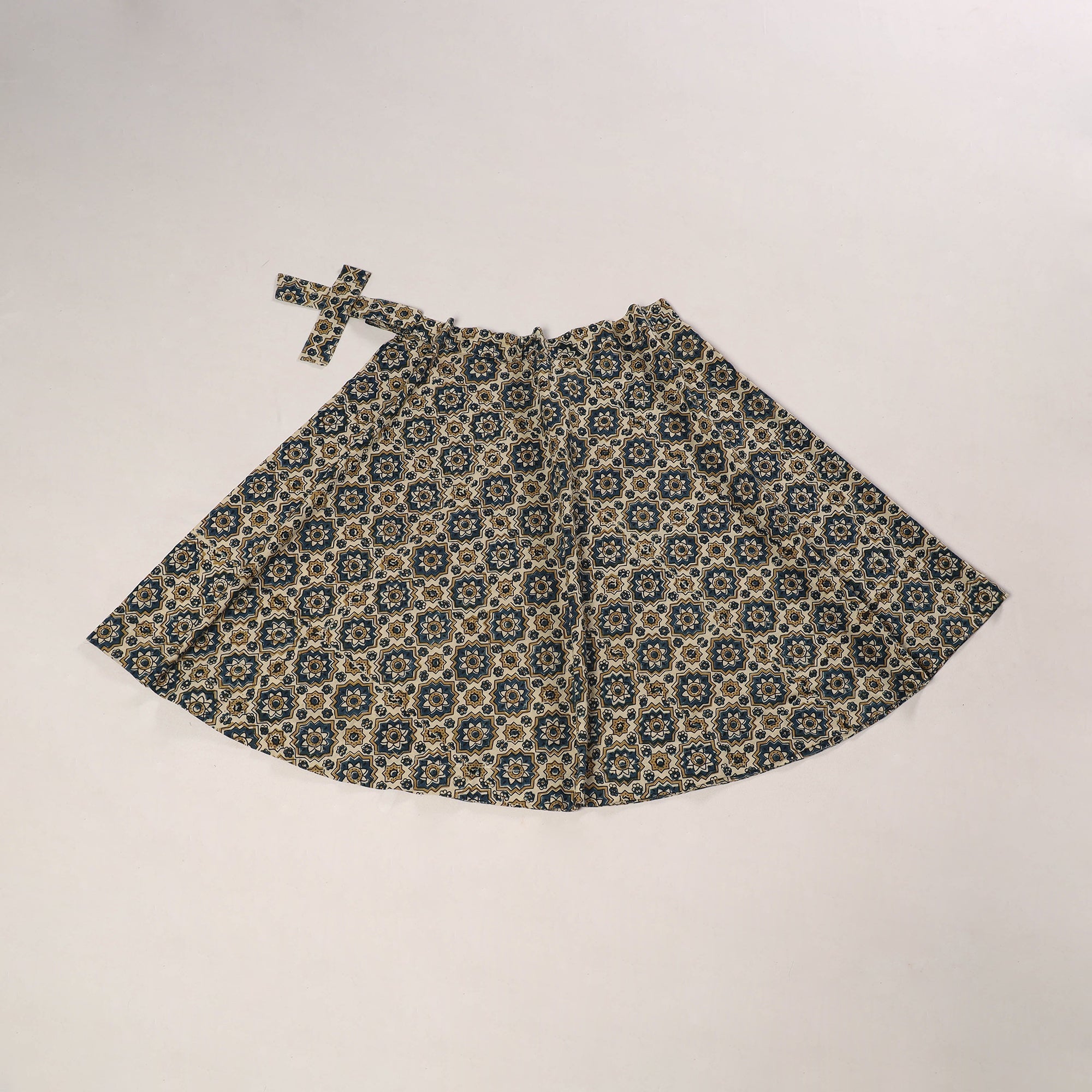 Bring a touch of tradition to your style with this beige natural dyed ajrakh print cotton wrap skirt. The adjustable tie-up waist ensures ease and comfort. Featuring with detailed block-printed ajrakh patterns in earthy colors, it’s suited for daily wear, holidays, casual events, or festive occasions.