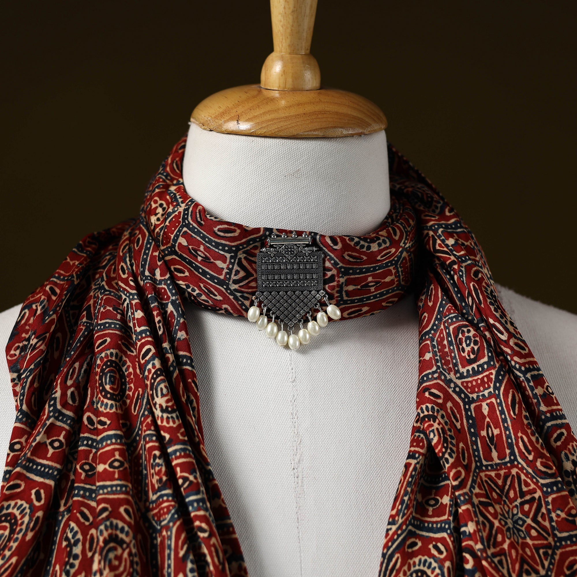 Ajrakh block print german silver brooch scarf is a versatile accessory designed for effortless styling. Soft and comfortable to wear, it features detailed block-printed motifs that add a distinctive touch. Made using modal silk, the scarf offers a balanced feel with a subtle sheen and a comfortable drape, making it suitable for everyday as well as occasion wear.
