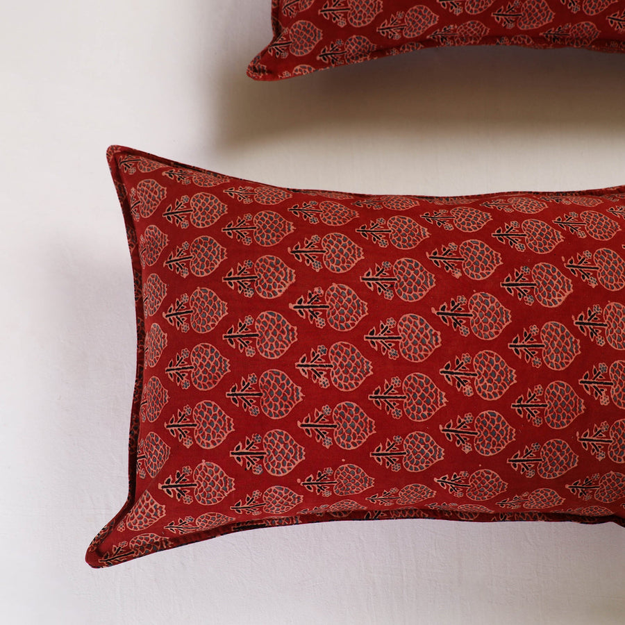 Enhance your home decor with this exquisite set of 2 red Ajrakh block print pillow covers, crafted using traditional block printing techniques. Renowned for its intricate patterns and rich heritage, Ajrakh artistry brings a timeless elegance and sustainable charm to your living space. Perfect for styling sofas and beds