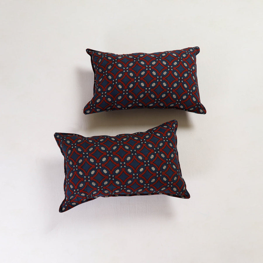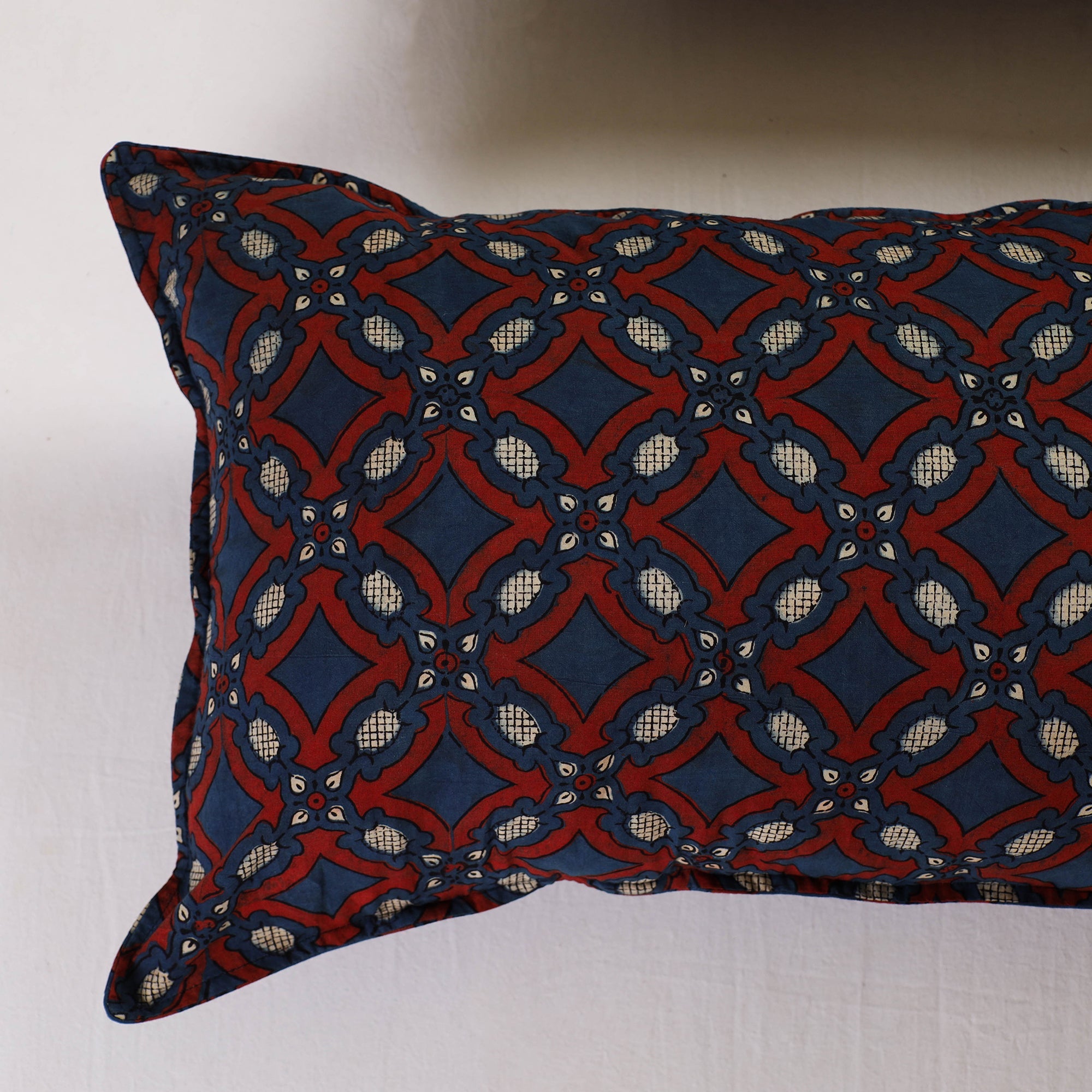 Enhance your home decor with this exquisite set of 2 blue Ajrakh block print pillow covers, crafted using traditional block printing techniques. Renowned for its intricate patterns and rich heritage, Ajrakh artistry brings a timeless elegance and sustainable charm to your living space. Perfect for styling sofas and beds