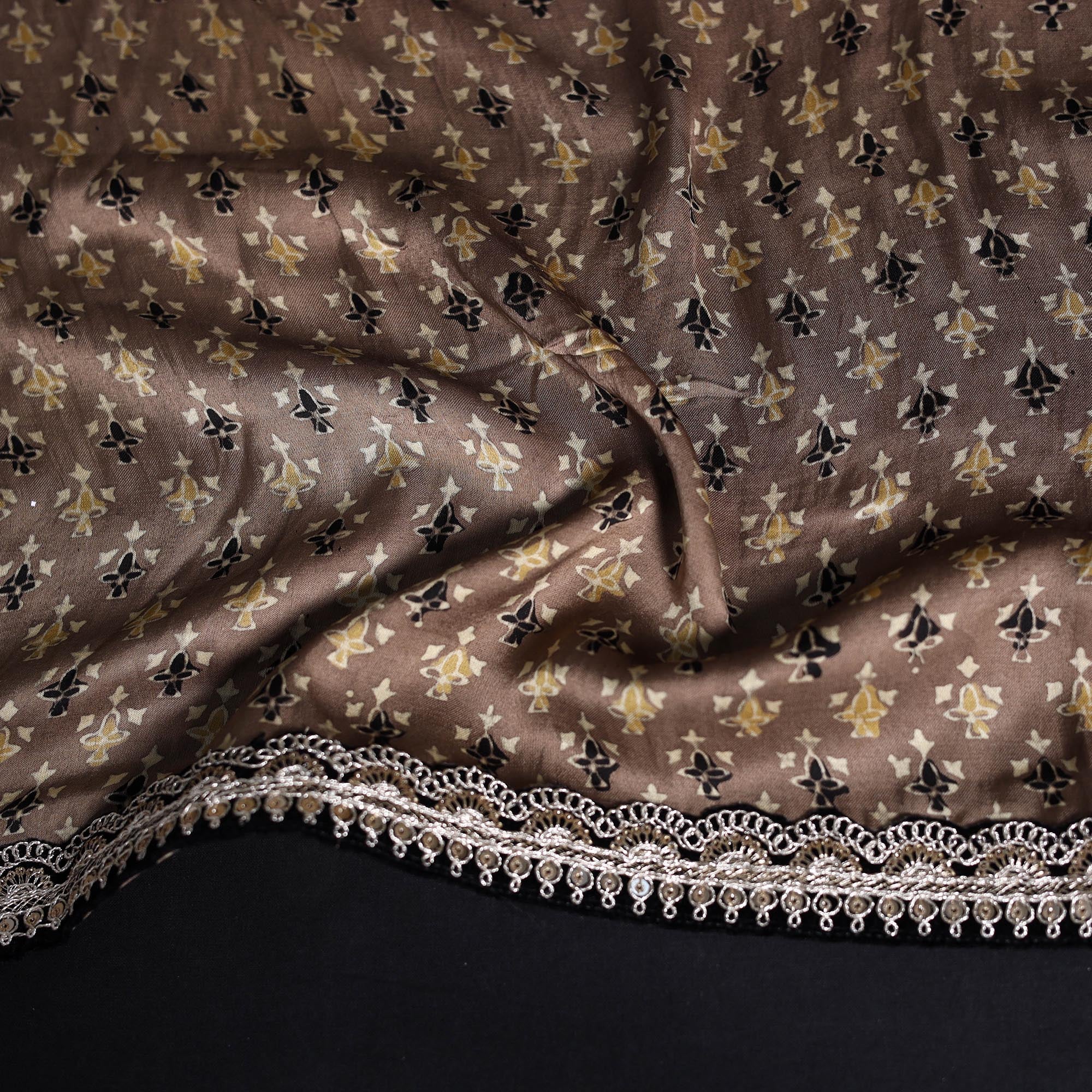 Brown lace work blouse piece created using ajrakh hand block printing techniques, an ancient craft estimated to be around 4,500 years old. It features motifs inspired by the textile traditions of Gujarat’s Kutch region. Made from modal fabric, known for its smooth texture and comfortable drape, it pairs well with a wide range of sarees. Easy to tailor in your preferred style, it’s a dependable choice for creating elegant and versatile blouse designs.