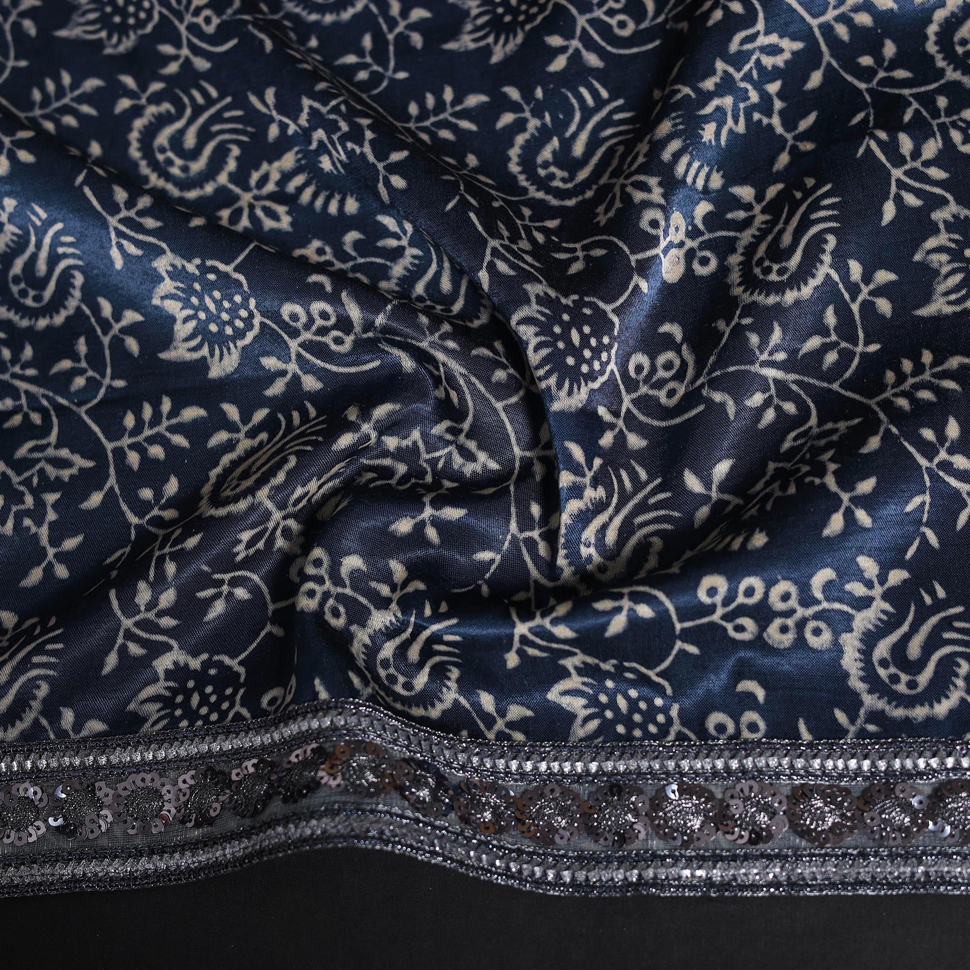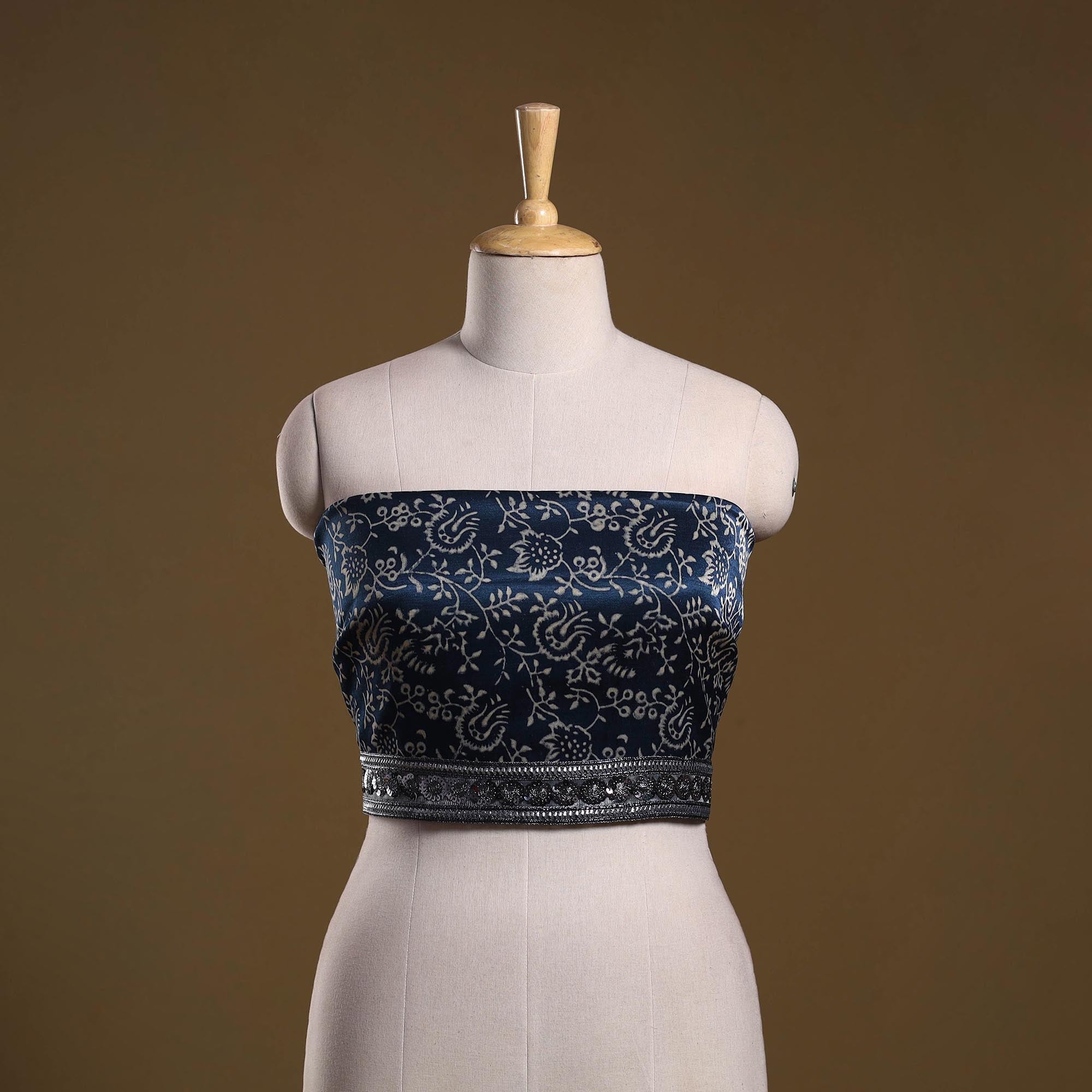Blue lace work blouse piece created using ajrakh hand block printing techniques, an ancient craft estimated to be around 4,500 years old. It features motifs inspired by the textile traditions of Gujarat’s Kutch region. Made from modal fabric, known for its smooth texture and comfortable drape, it pairs well with a wide range of sarees. Easy to tailor in your preferred style, it’s a dependable choice for creating elegant and versatile blouse designs.
