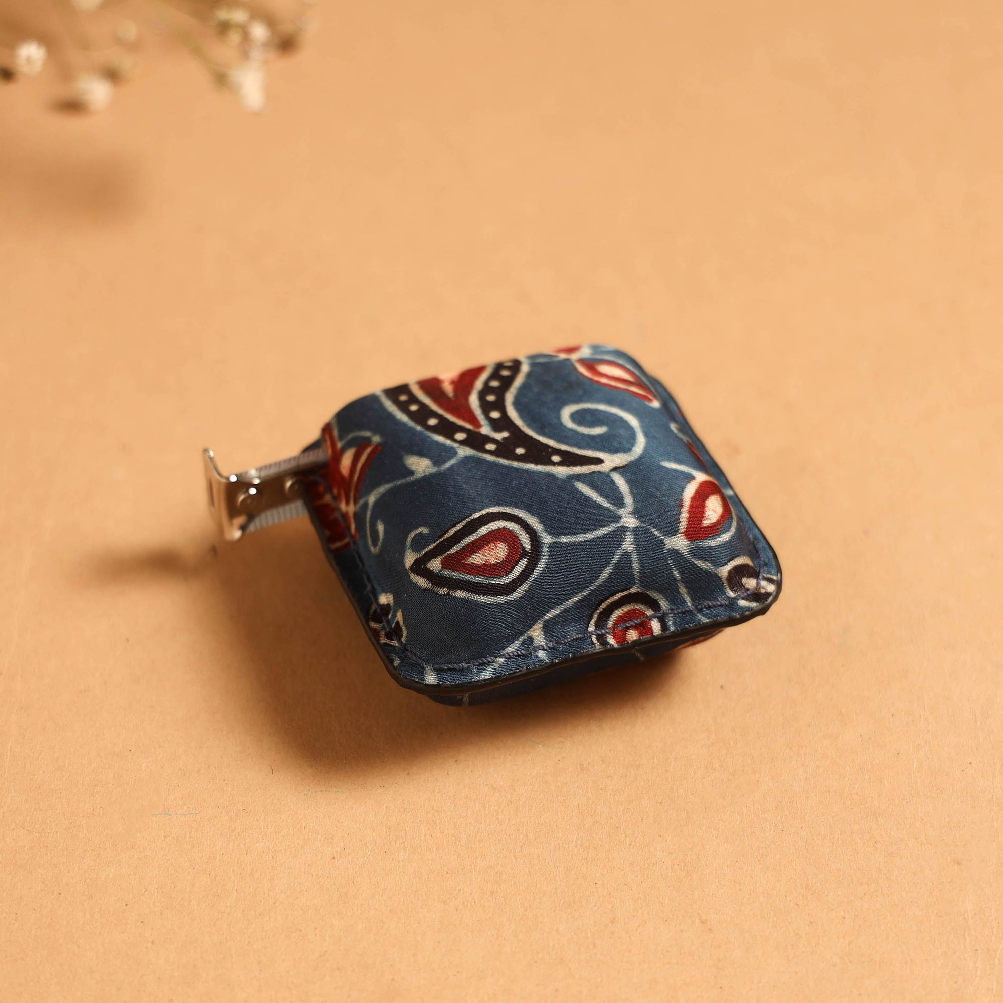 Multipurpose measuring tape features a ajrakh block printed cotton fabric cover, adding a touch of tradition to a practical essential. Crafted with a durable iron tin sheet and clear ruler markings, it ensures accurate measurements and long-lasting use. Perfect for interior designers, architects and everyday projects.
