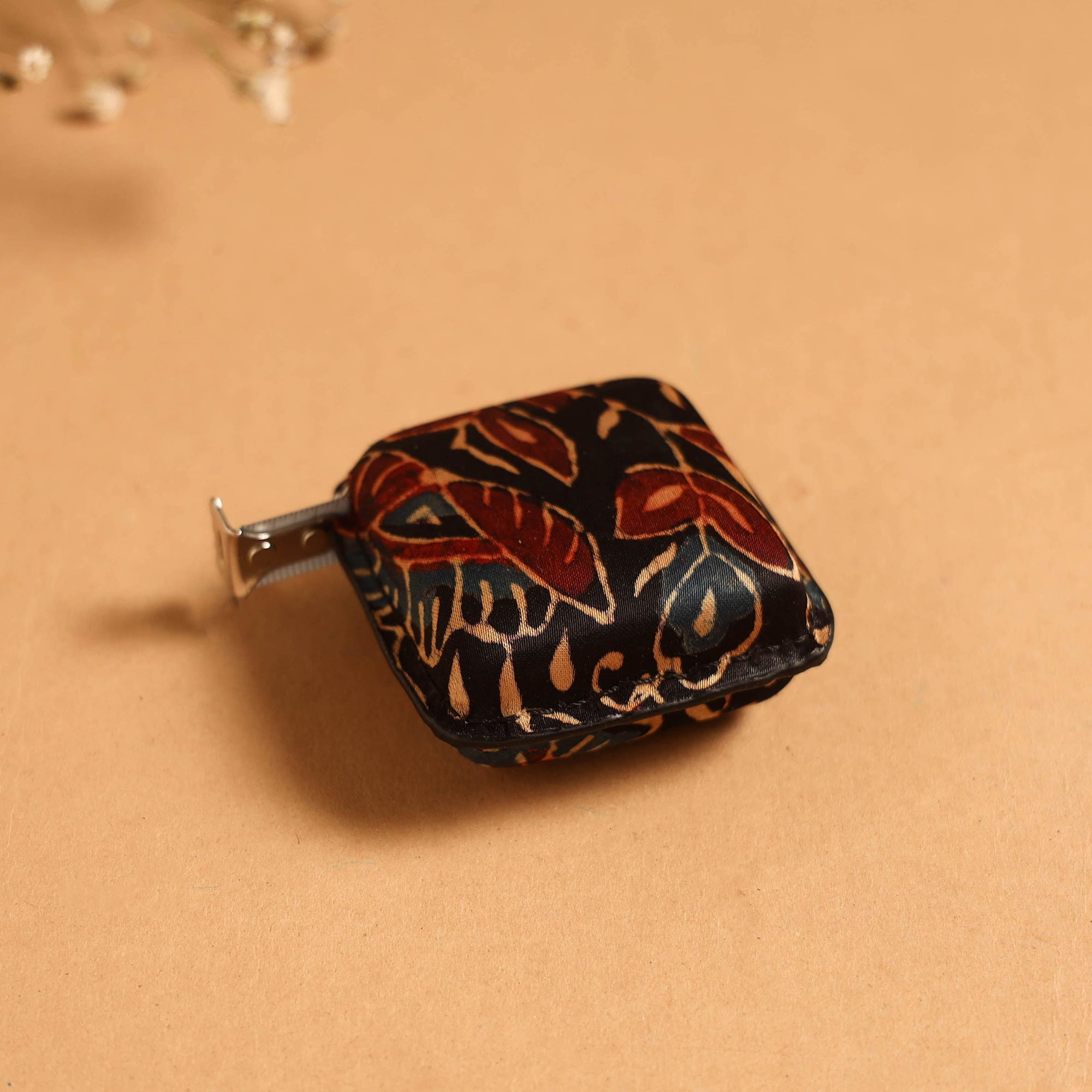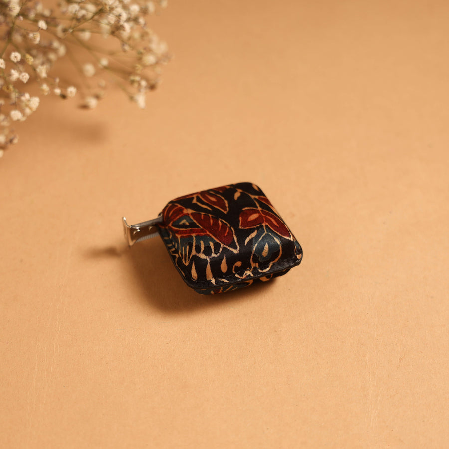 Multipurpose measuring tape features a black ajrakh block printed cotton fabric cover, adding a touch of tradition to a practical essential. Crafted with a durable iron tin sheet and clear ruler markings, it ensures accurate measurements and long-lasting use. Perfect for interior designers, architects and everyday projects.
