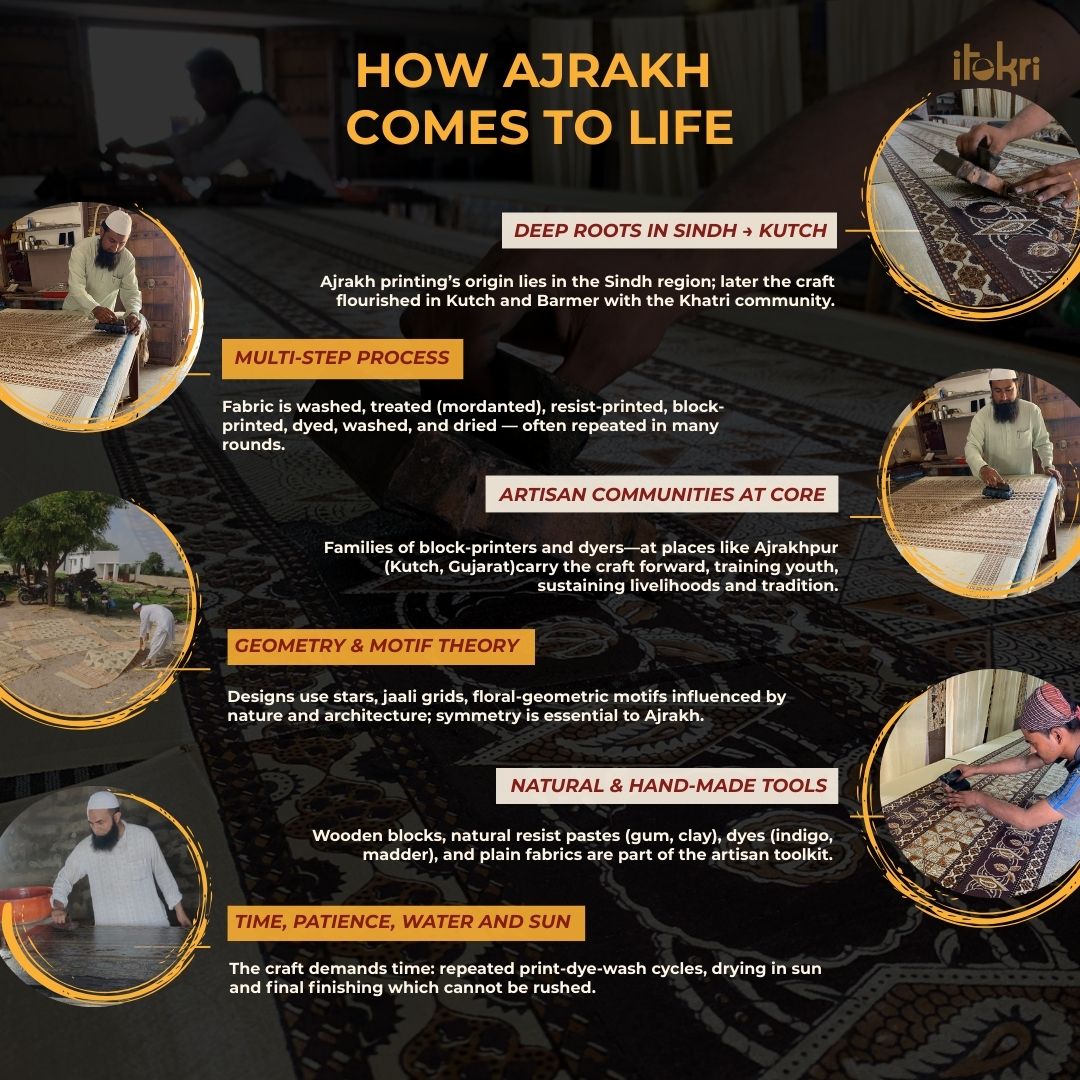 Ajrakh is a well-known traditional vegetable dyeing that resists block-printing techniques on cloth. Originated in Kutch, It is nearly around 4,500 years old practised by Khatri community of Kutch and Sikh.