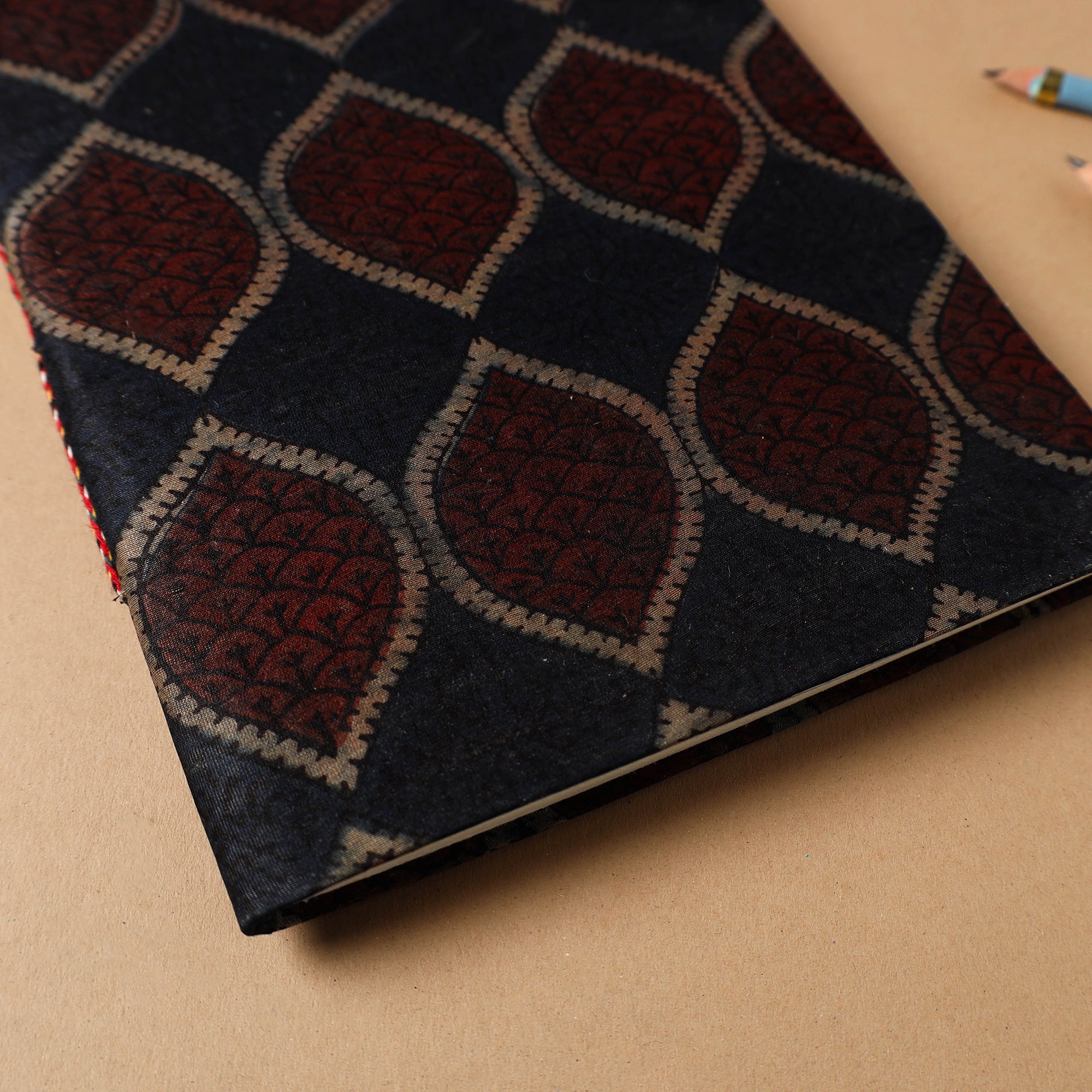 Material This hardbound notebook features a cover made from black ajrakh block print cotton fabric. The pages are crafted from recycled cotton and natural fibers, providing an eco-friendly and sustainable writing experience. Handmade by skilled artisans using traditional bookbinding techniques, this notebook is perfect for journaling, note-taking, or gifting.