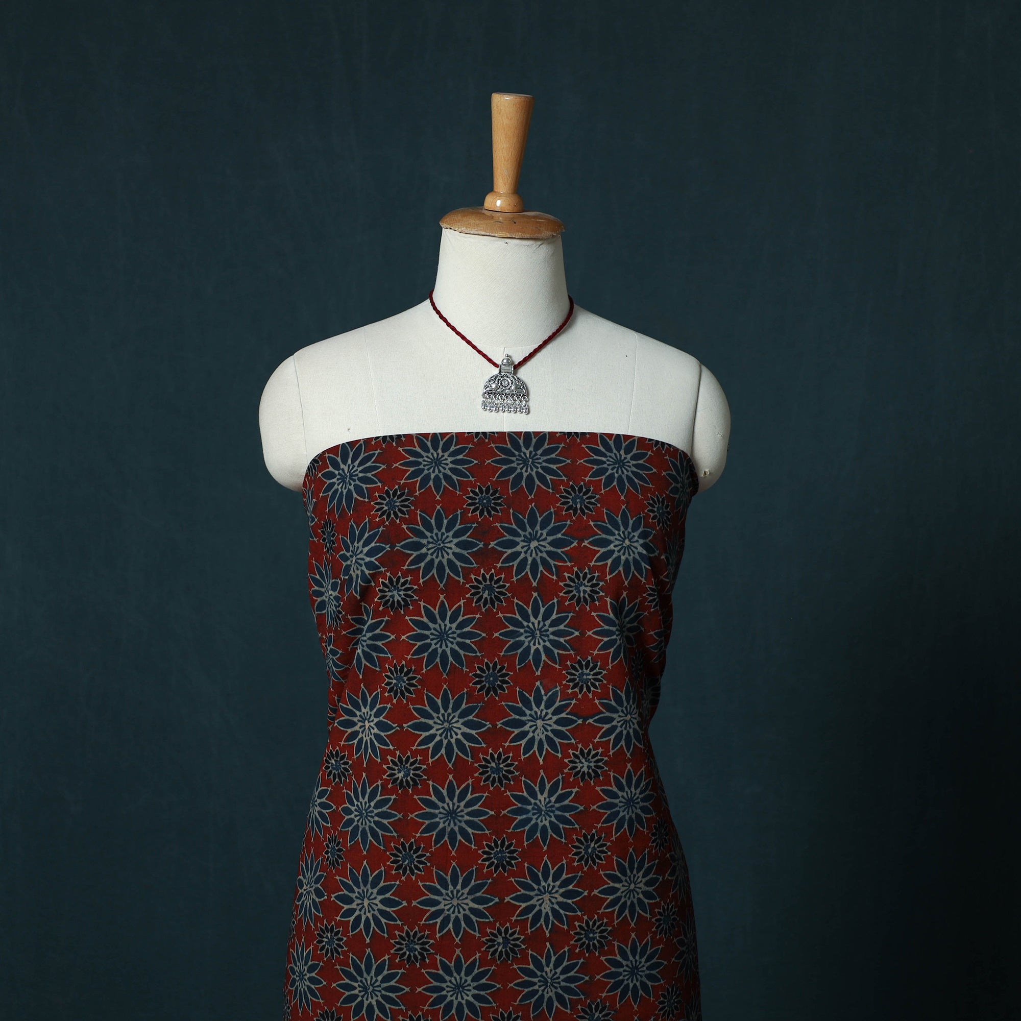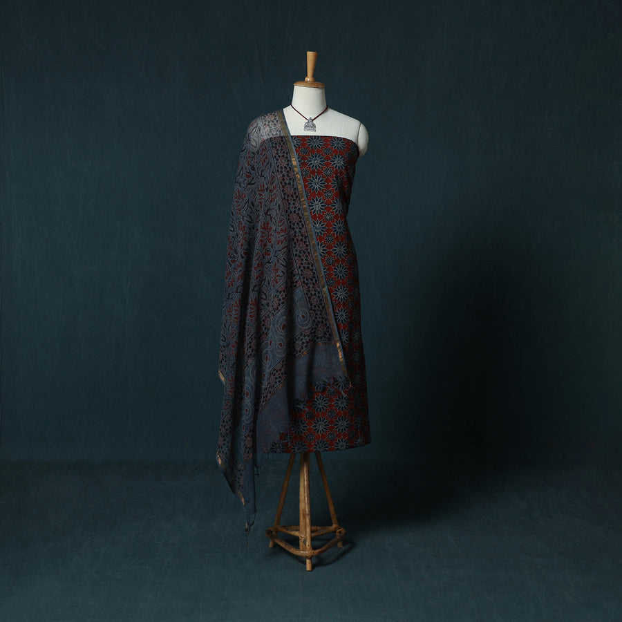 • Ajrakh Hand Block Print Natural Dyed Cotton 2pc Unstitched Dress Material Kurta Set with Jewellery Set 24