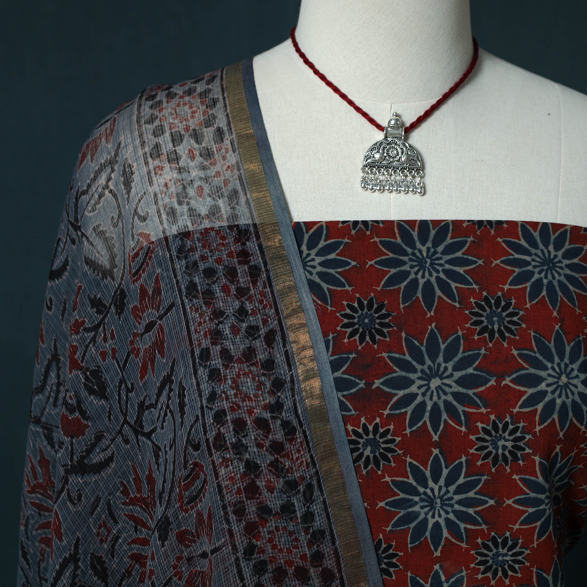 Ajrakh hand block print cotton 2pc unstitched dress material kurta set is crafted using traditional natural-dyeing and resist block-printing techniques practiced for generations in the Kutch region. This ancient craft is estimated to be around 4,500 years old and is known for its deep, earthy colours and ethnic motifs. Paired with a kota doria cotton dupatta, kota doria is an age-old Indian textile produced in the Kota district of Rajasthan. The doria or the threads are finely interweaves to make the check patterns. Its lightweight and sheer texture giving an exquisite grace and elegance of its own. This set also comes with handcrafted matching necklace and earrings to complete your look. It is suitable for festive gatherings, family functions, casual outing, and everyday wear.