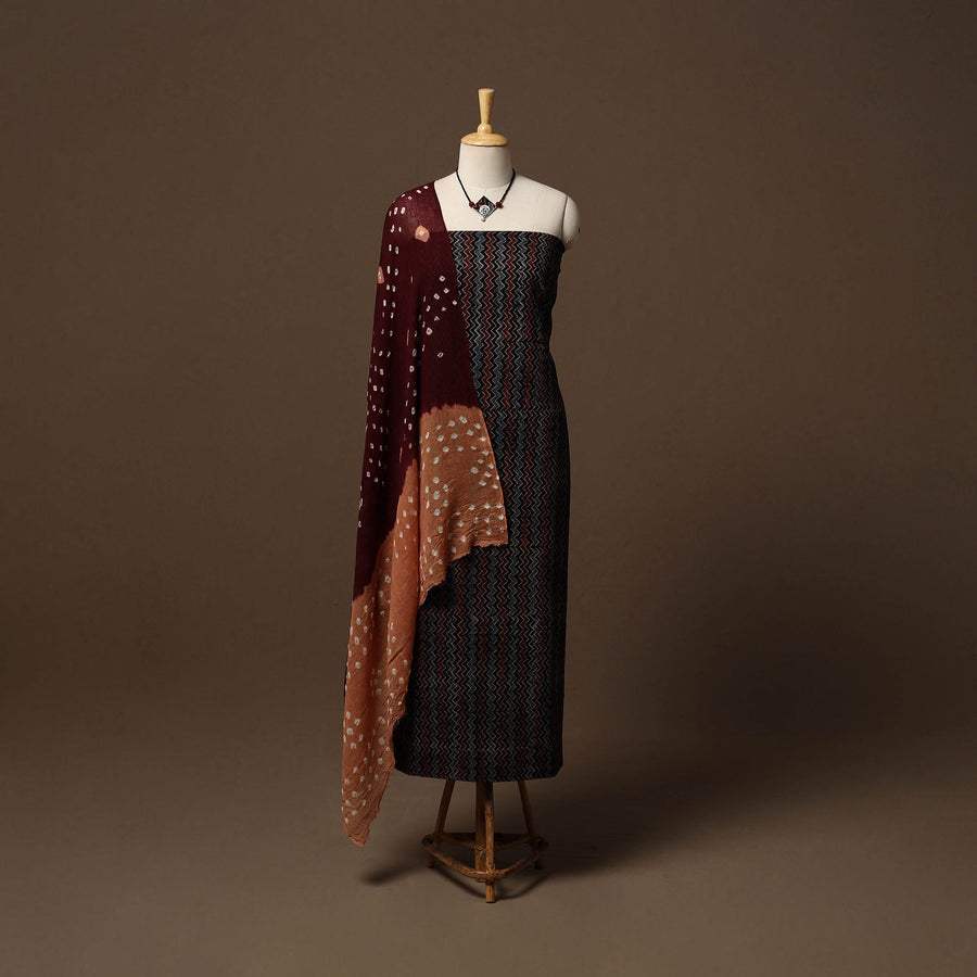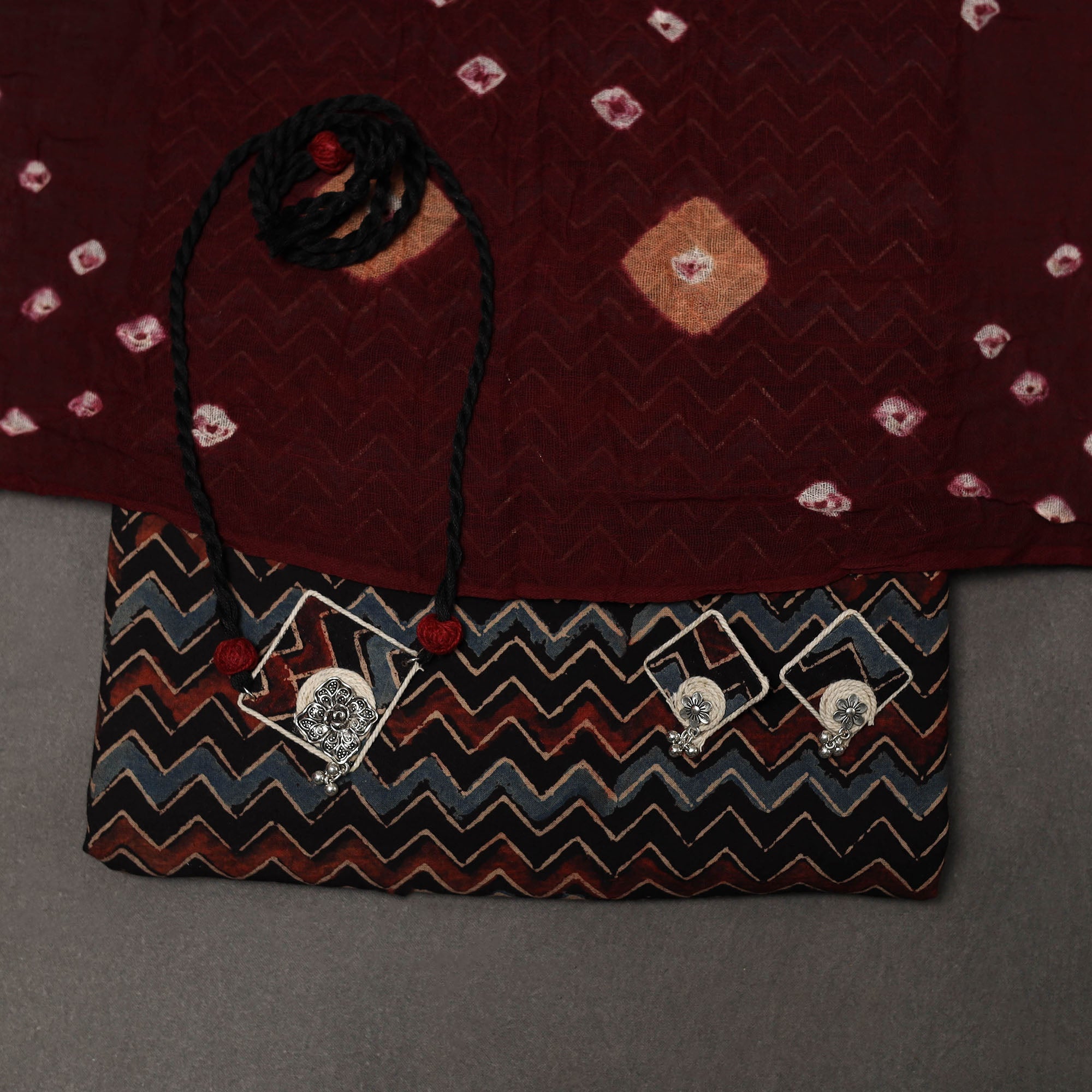 Ajrakh hand block print cotton 2pc unstitched dress material is crafted using traditional natural-dyeing and resist block-printing techniques practiced for generations in the Kutch region. This ancient craft is estimated to be around 4,500 years old and is known for its deep, earthy colours and ethnic motifs. Paired with an bandhani tie-dye dupatta with border, the set also comes with a handcrafted necklace and matching earrings to complete your look, making it perfect for family gatherings, traditional events or special occasions.