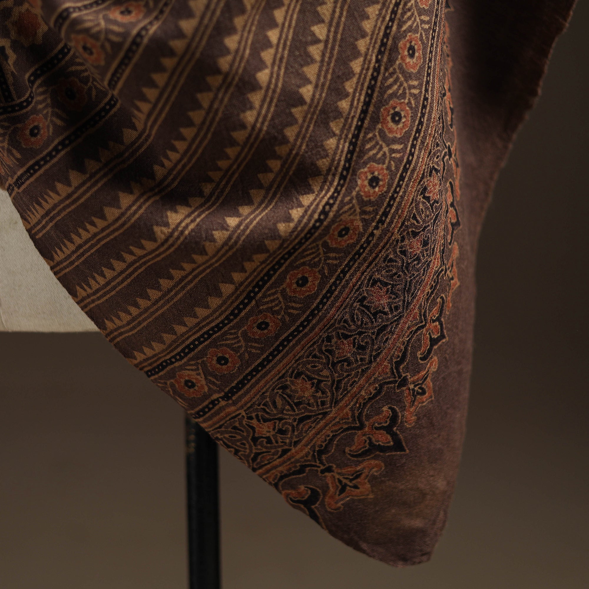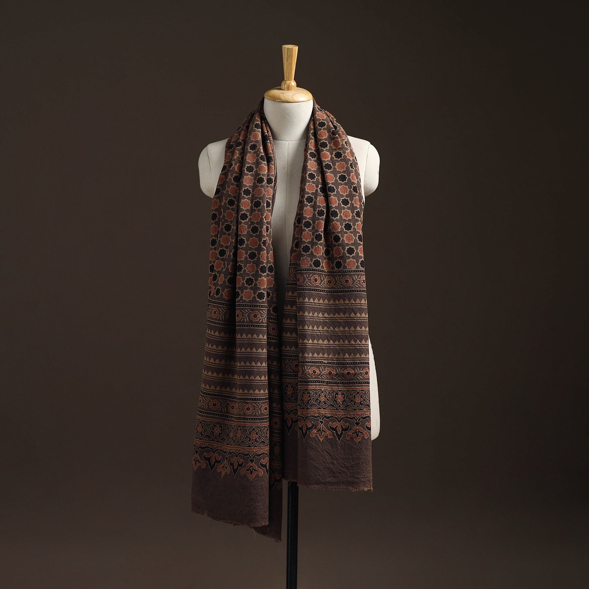 Ajrakh traditional hand block print acrylic wool shawl is created using long-practiced dyeing and printing techniques from Kutch, Gujarat. Designed for the winter season, the wool offers consistent warmth while remaining comfortable for everyday wear. The intricate Ajrakh patterns bring a refined, understated elegance, making it a thoughtful choice for those who appreciate culturally rooted textiles in their winter wardrobe.