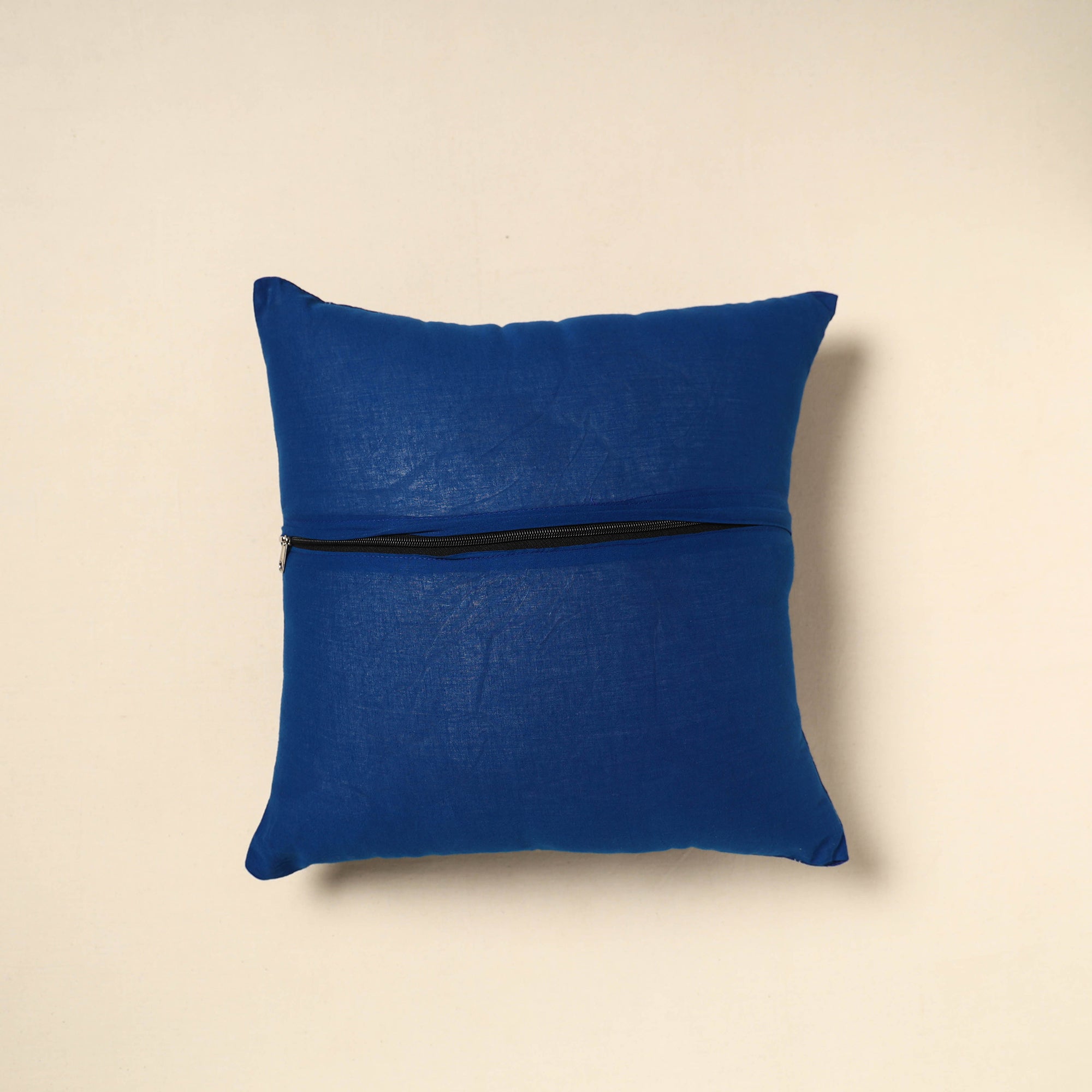 Elevate your space with this blue Ikat cushion cover made from soft cotton and detailed with ajrakh modal silk patchwork. Expertly created by artisans, its vibrant patterns and rich textures bring a timeless touch to sofas, cozy corners, and bedrooms chairs, or as a thoughtful gift.