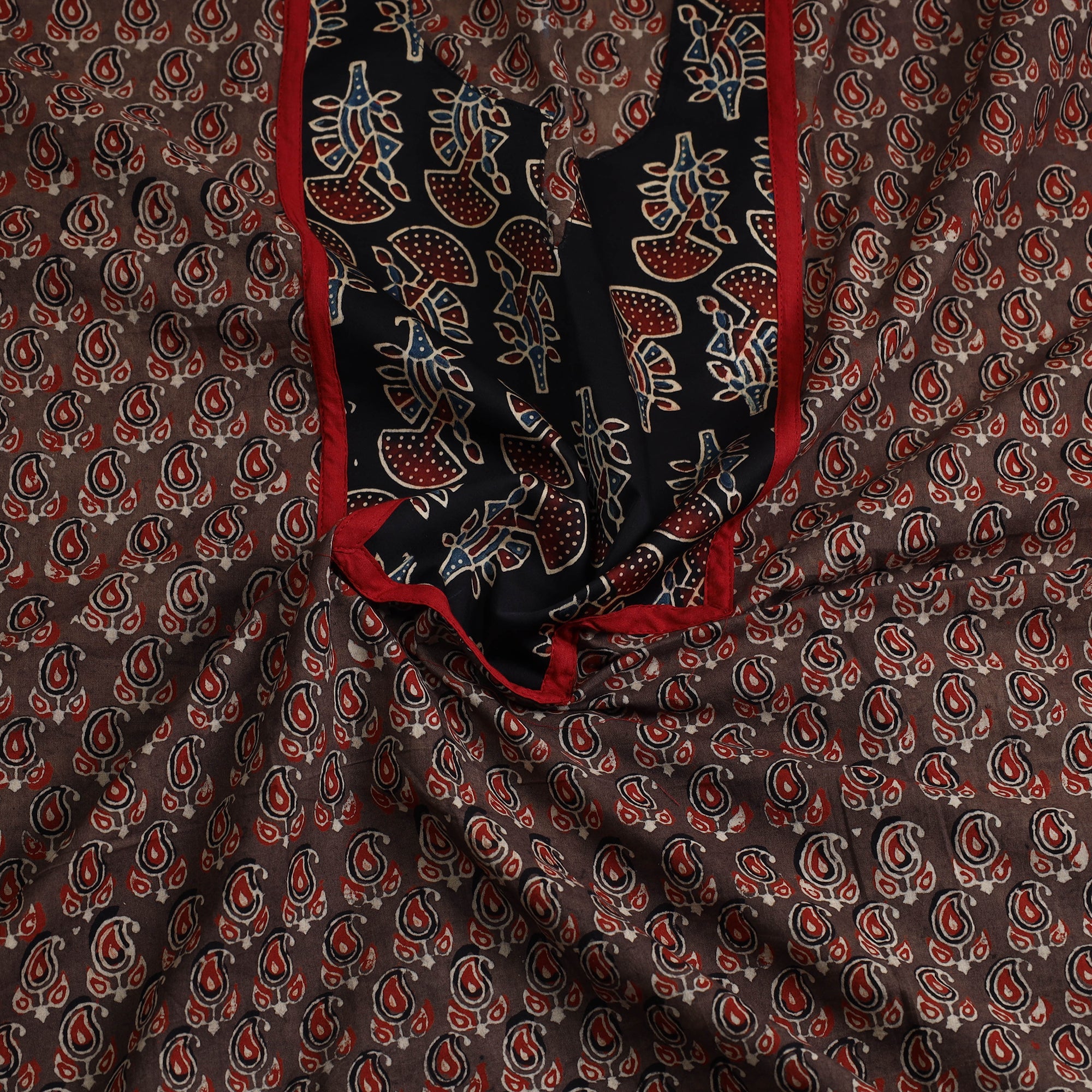 Brown ajrakh print cotton patchwork kurta material. Made by skilled artisans from Kutch, it features intricate block prints that reflect centuries-old traditions. It offers both elegance and comfort for any special occasion.