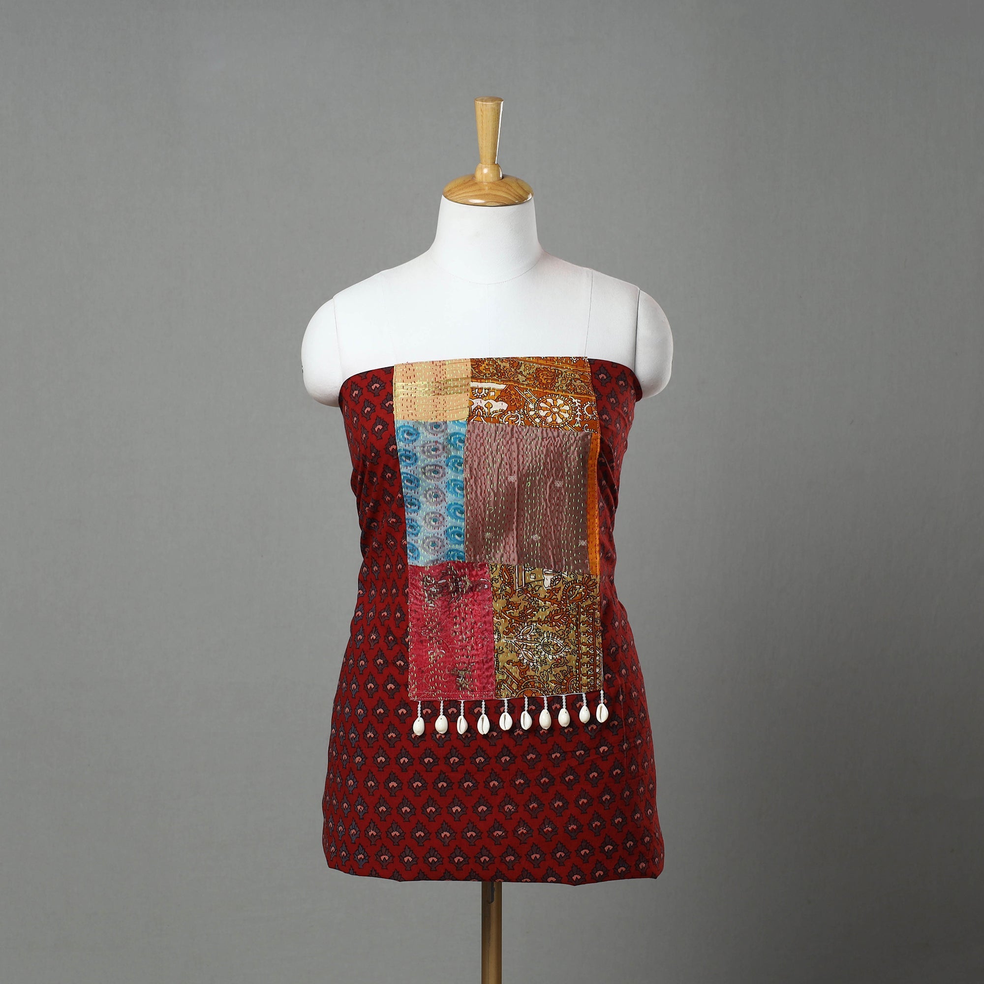 Red ajrakh print cotton patchwork kurta material. Made by skilled artisans from Kutch, it features intricate block prints that reflect centuries-old traditions. It offers both elegance and comfort for any special occasion.
