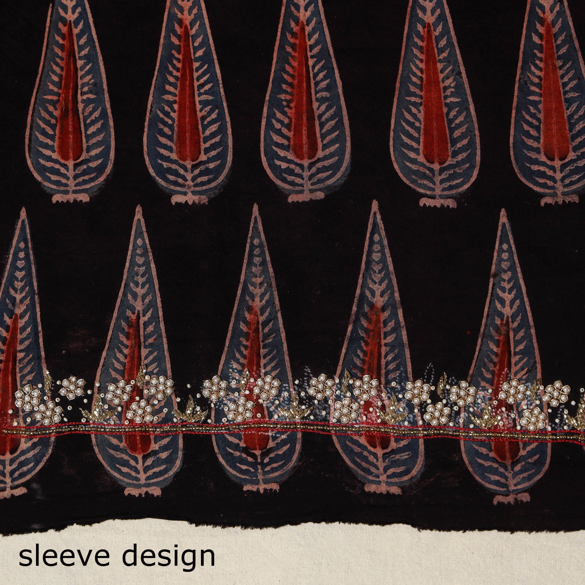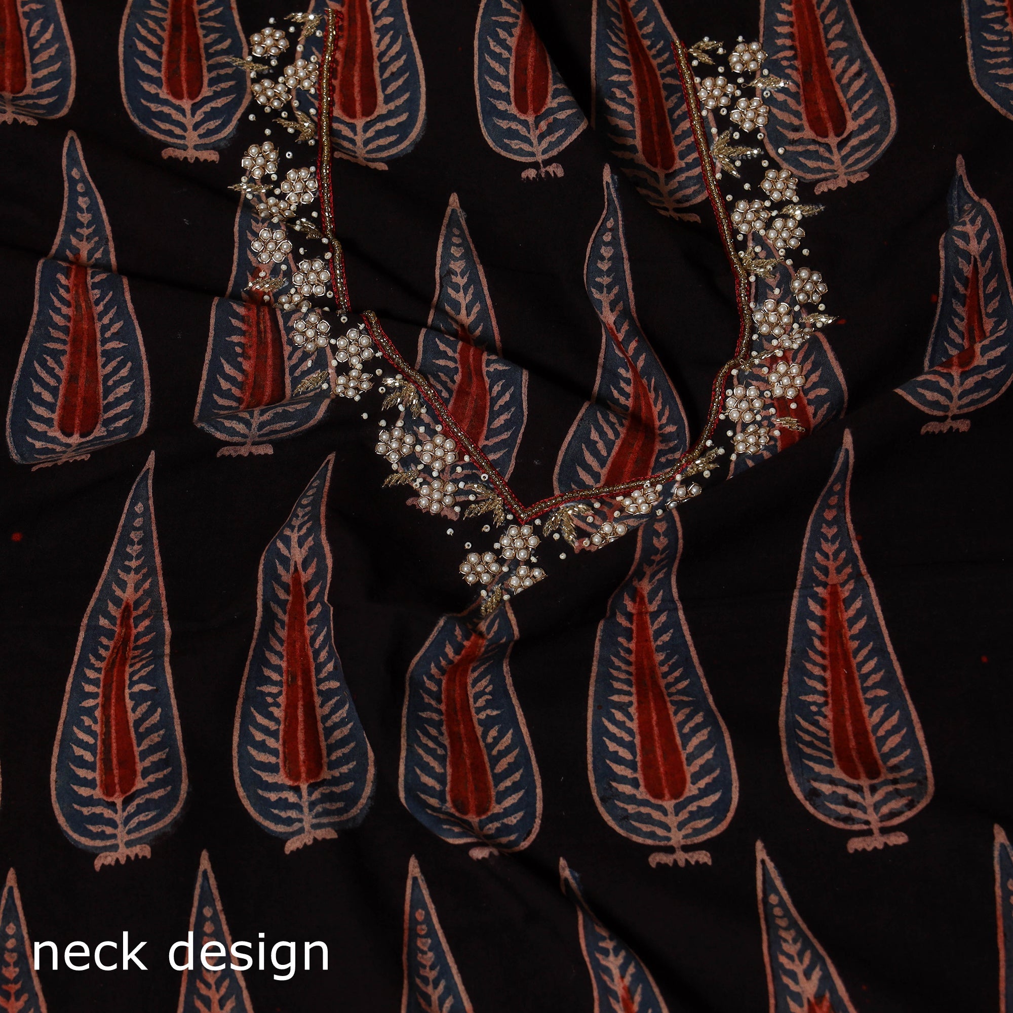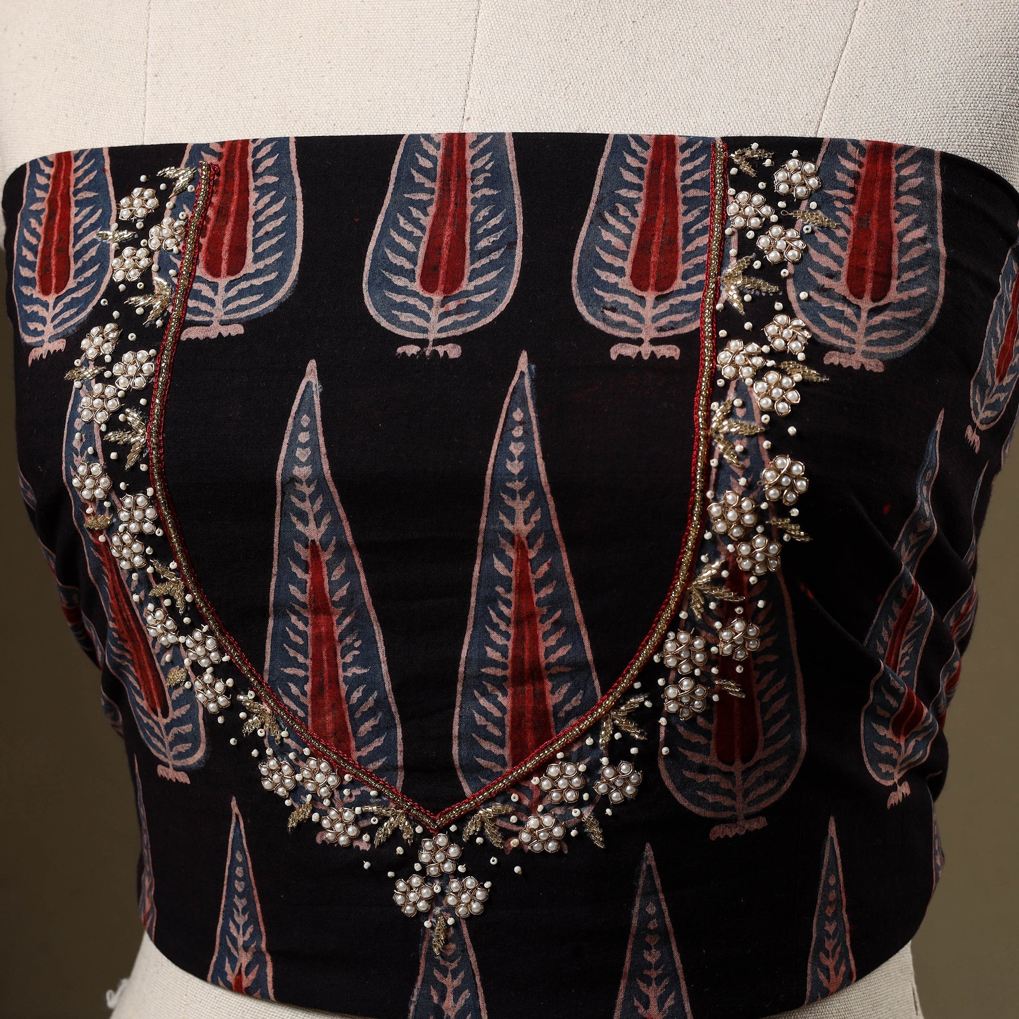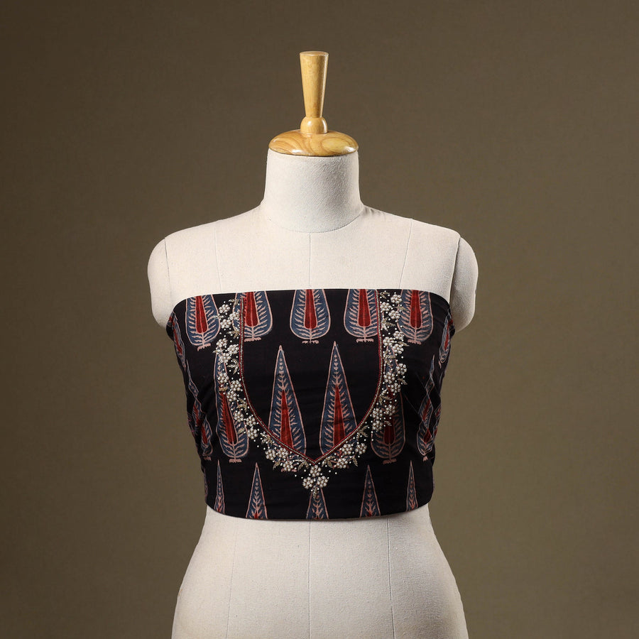 This black handcrafted blouse piece showcases hand embroidery on traditional ajrakh block print fabric, blending artisanal beauty with everyday comfort. Perfect for pairing with sarees, it adds a refreshing touch to both festive looks and daily wear. The breathable cotton fabric ensures ease and elegance all day long.