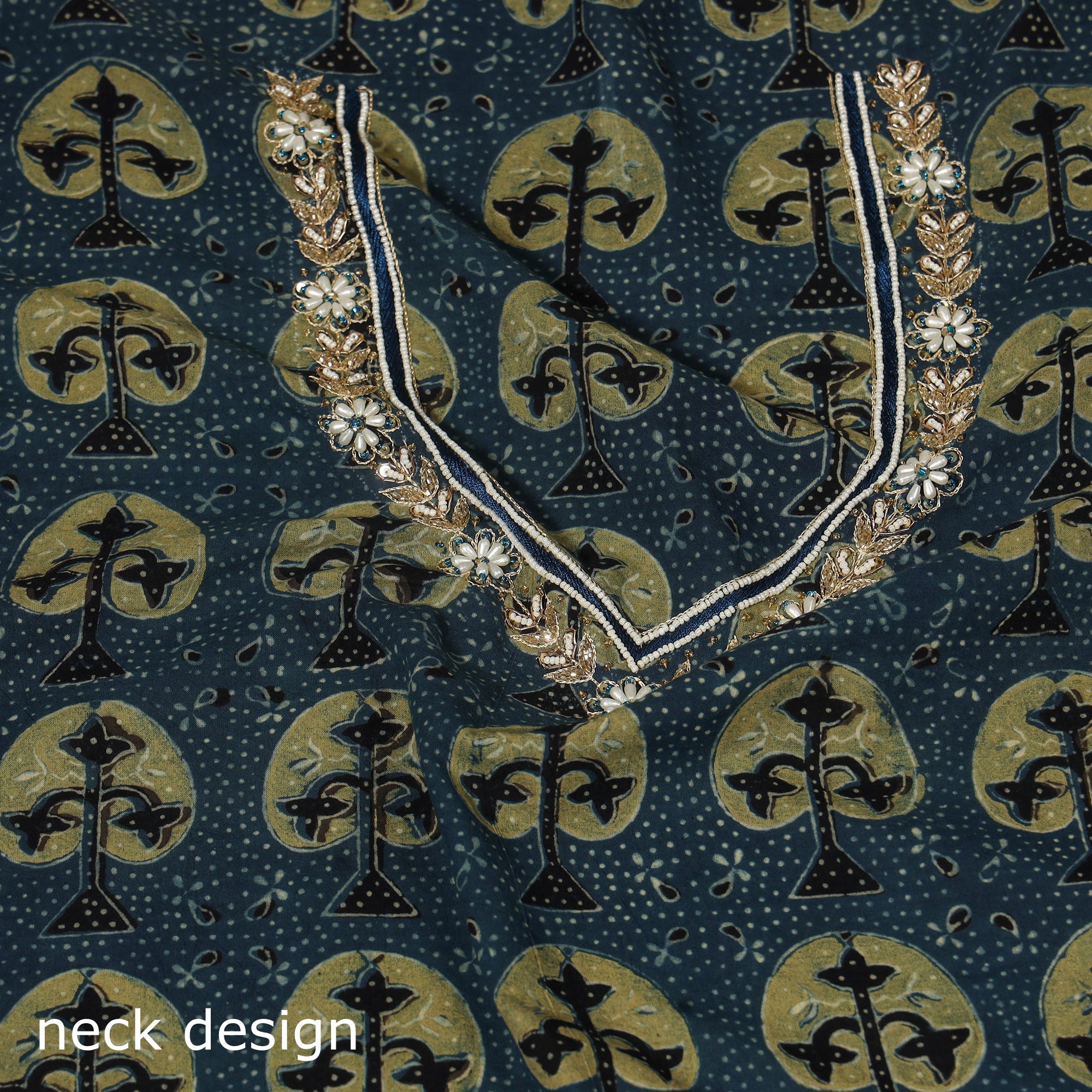 This blue handcrafted blouse piece showcases hand embroidery on traditional ajrakh block print fabric, blending artisanal beauty with everyday comfort. Perfect for pairing with sarees, it adds a refreshing touch to both festive looks and daily wear. The breathable cotton fabric ensures ease and elegance all day long.