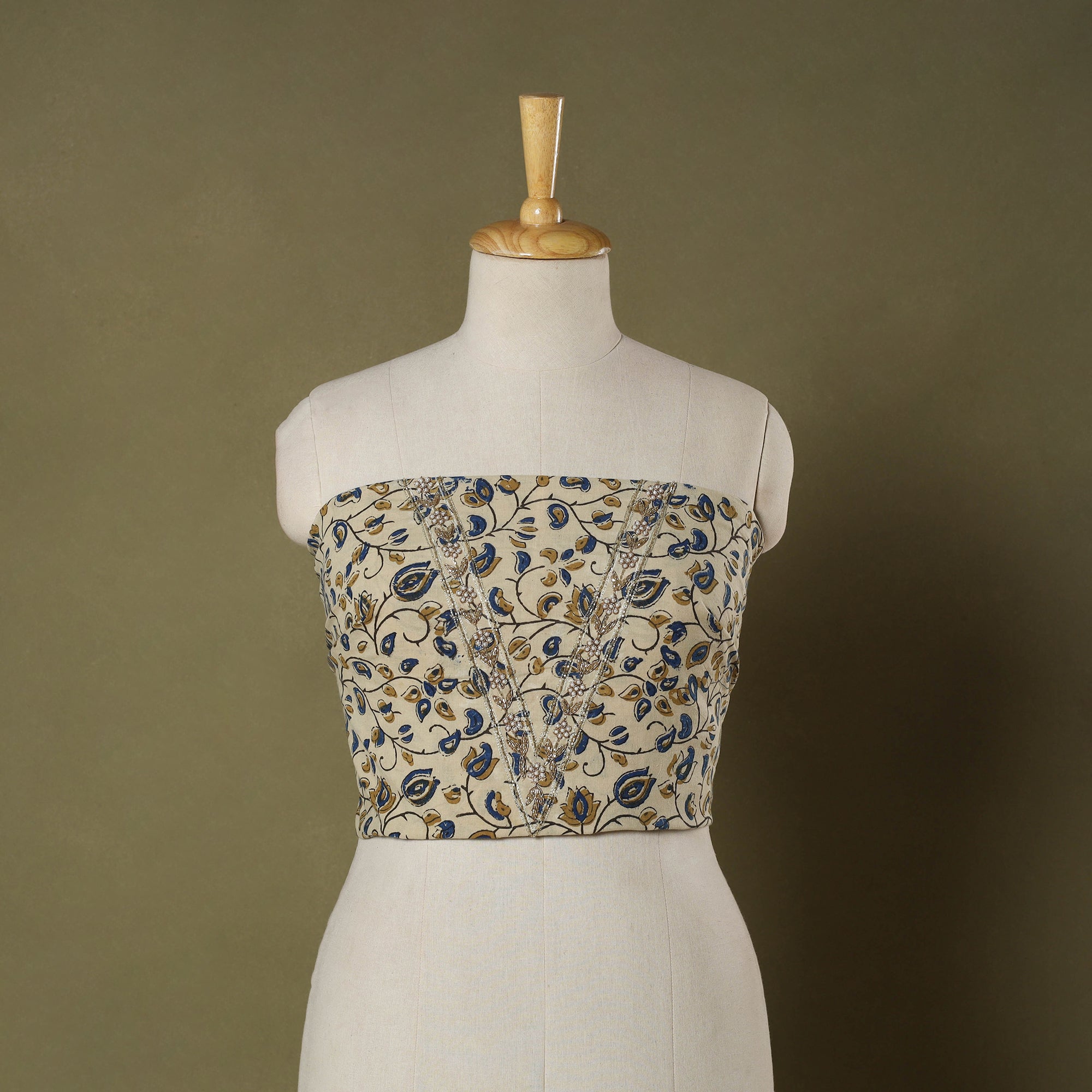 This handcrafted beige blouse piece showcases detailed hand embroidery on ajrakh block-printed cotton fabric, blending traditional artistry with everyday comfort. Perfect for saree pairings, it can be tailored into stylish blouses suited for both casual and festive wear.