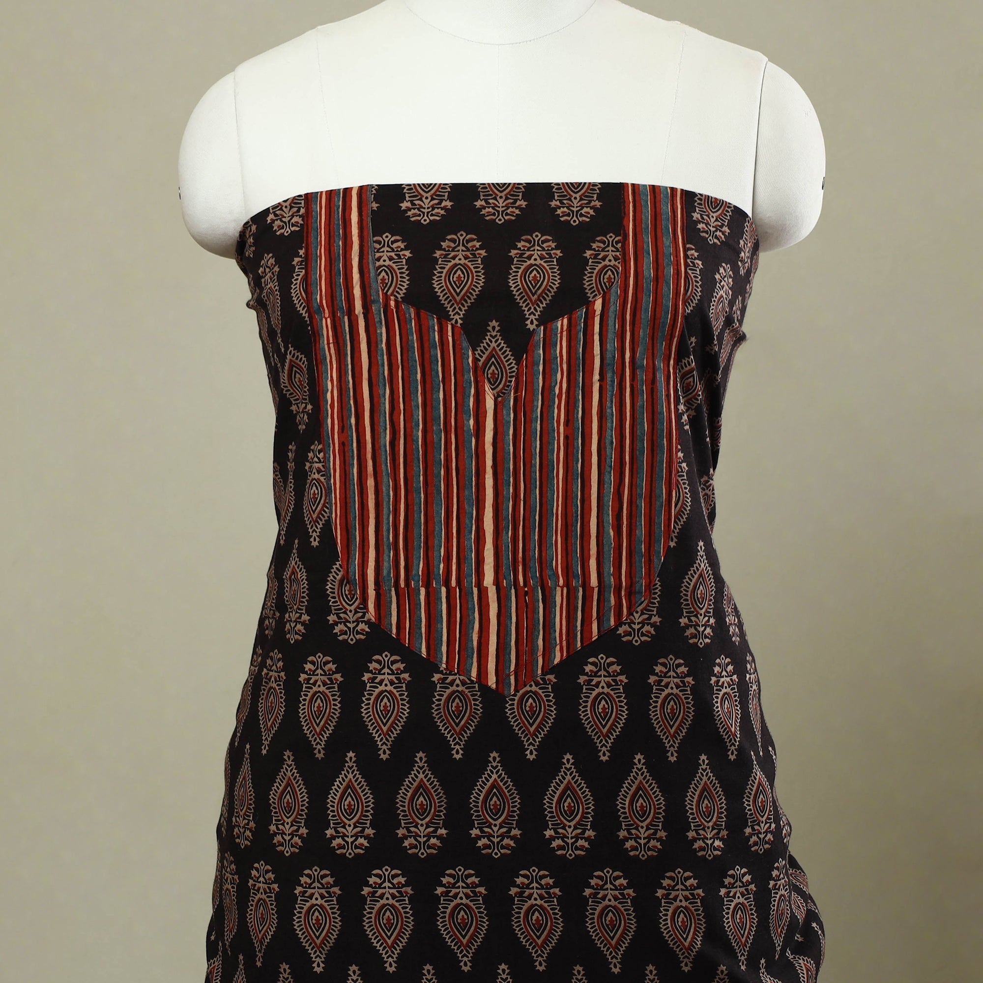 Step into the world of heritage fashion with this black ajrakh patchwork kurta material. Featuring intricate traditional prints, each piece is a tribute to skilled craftsmanship. Its soft cotton weave ensures elegance meets ease in every stitch.