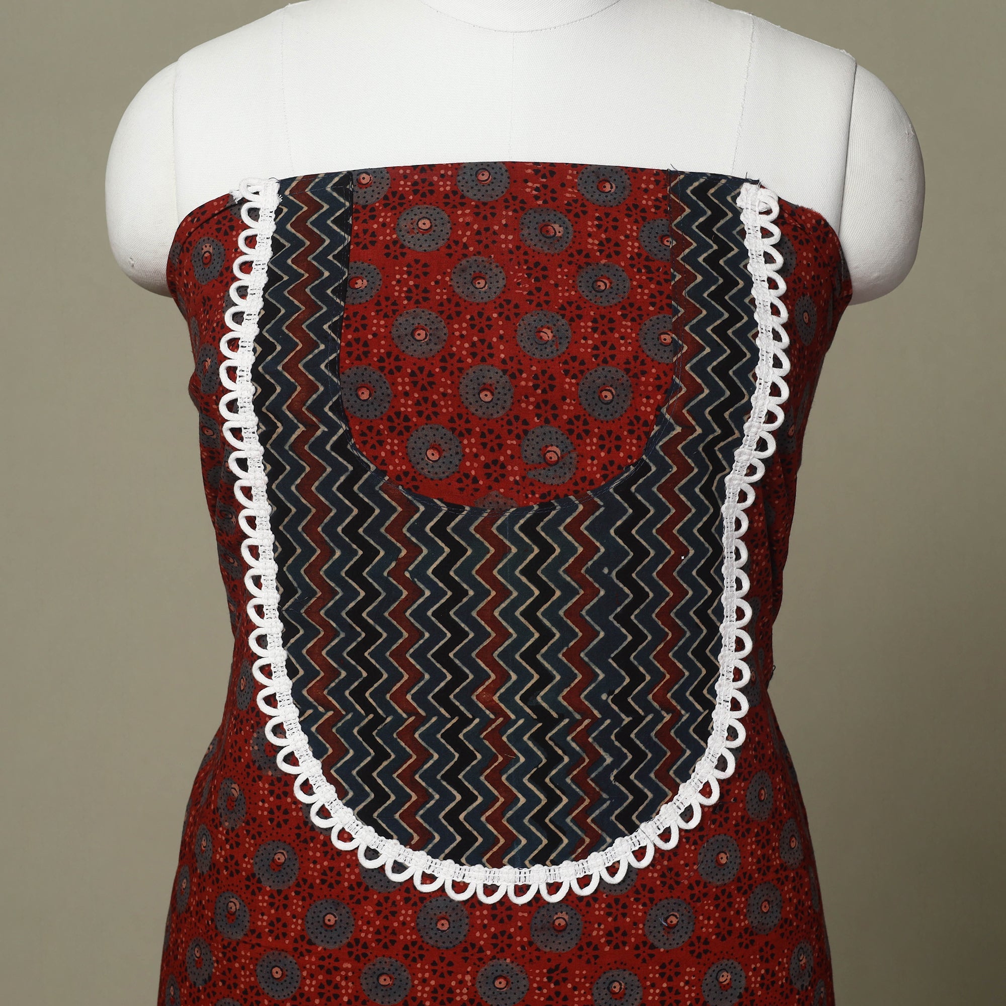 Add a touch of tradition to your wardrobe with this red ajrakh print patchwork cotton kurta material. Crafted using the traditional block printing technique, it features intricate, vibrant patterns that showcase India's rich artistic heritage. Made from soft, breathable cotton, this fabric is perfect for creating custom kurtas that combine comfort, style, and cultural elegance.