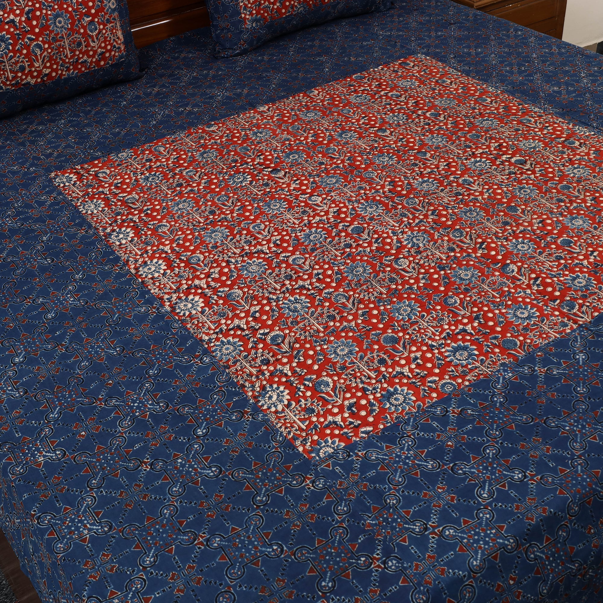 This blue cotton bedsheet set beautifully blends two distinct styles of Indian block printing. Ajrakh and bagru. The base features intricate ajrakh motifs, while bagru-style patchwork adds a touch of rustic elegance. Both printing techniques use hand-carved wooden blocks and reflect centuries-old artisanal traditions. Crafted from breathable cotton, the set includes one double bedsheet and two matching pillow covers, bringing a thoughtful, handmade touch to your living space.