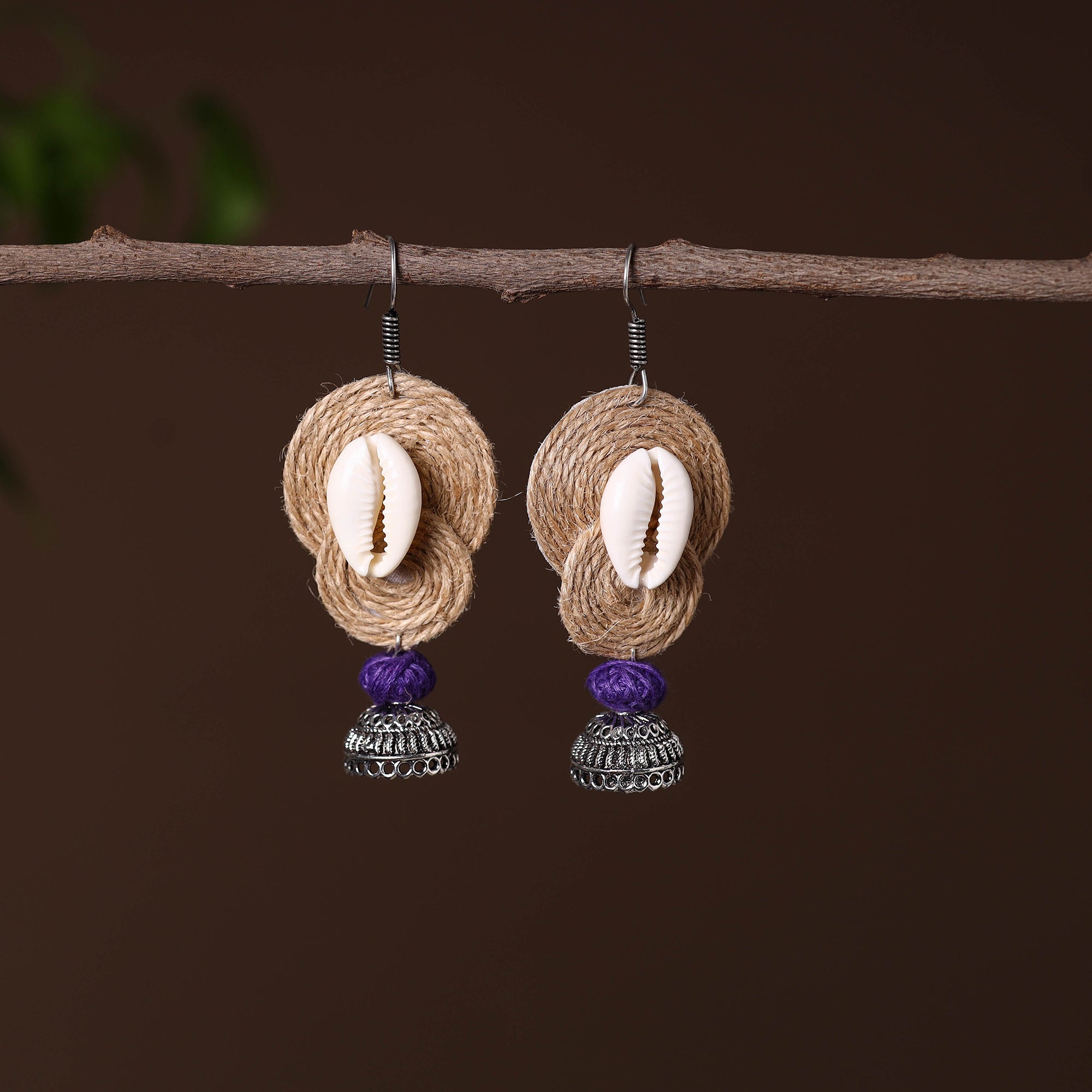 These beige handcrafted german silver jute jhumki earrings. Featuring intricate jute, seashell, and thread detailing, these earrings add a unique and vibrant touch to your look. Perfect for casual wear or festive occasions.