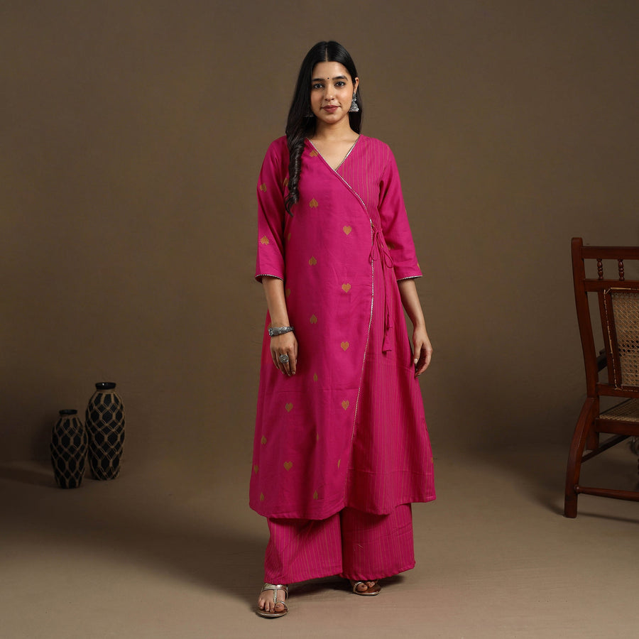 •  Pink Angrakha Cotton Gota Work Jacquard Kurta for Women