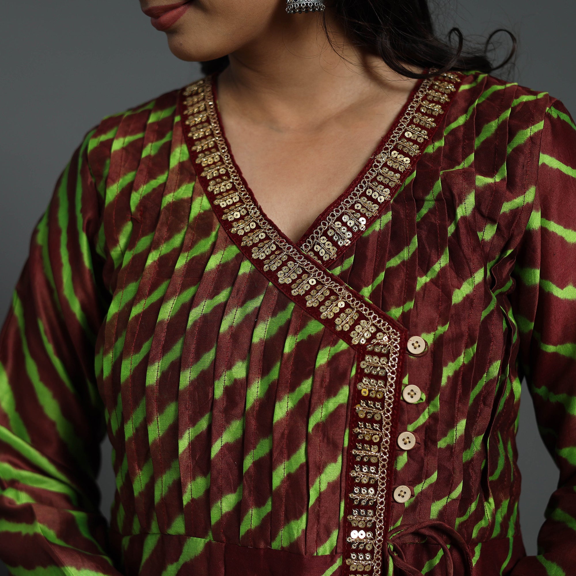 Maroon angrakha handloom chanderi silk tie-dye leheriya kurta is a stunning blend of tradition and elegance. Leheriya, a traditional tie-dye technique from Rajasthan, is known for its vibrant, wavy patterns created by skilled artisans. This kurta features delicate lace work, intricate pintuck, and a graceful angrakha style, making it a perfect choice for festive and casual occasions.